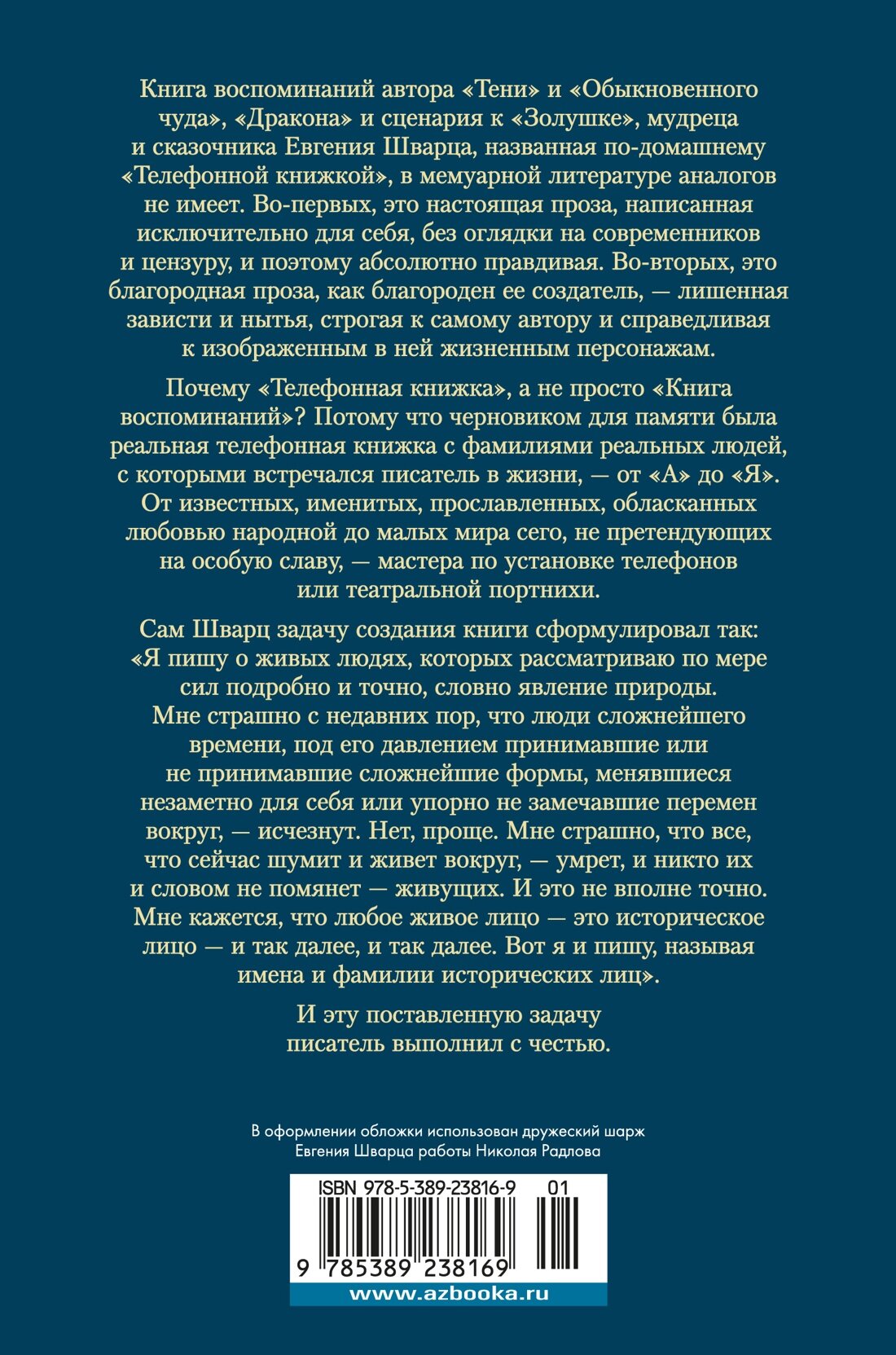 Книга воспоминаний автора «Тени» и «Обыкновенного чуда», «Дракона» и сценария к «Золушке», мудреца и сказочника Евгения Шварца, названная по-домашнему «Телефонной книжкой», в мемуарной литературе аналогов не имеет. Во-первых, это настоящая проза, написанная исключительно для себя, без оглядки на современников и цензуру, и поэтому абсолютно правдивая. Во-вторых, это благородная проза, как благороден ее создатель, — лишенная зависти и нытья, строгая к самому автору и справедливая к изображенным в ней жизненным персонажам. Почему «Телефонная книжка», а не просто «Книга воспоминаний»? Потому что черновиком для памяти была реальная телефонная книжка с фамилиями реальных людей, с которыми встречался писатель в жизни, — от «А» до «Я». От известных, именитых, прославленных, обласканных любовью народной до малых мира сего, не претендующих на особую славу, — мастера по установке телефонов или театральной портнихи. Сам Шварц задачу создания книги сформулировал так: «Я пишу о живых людях, которых рассматриваю по мере сил подробно и точно, словно явление природы. Мне страшно с недавних пор, что люди сложнейшего времени, под его давлением принимавшие или не принимавшие сложнейшие формы, менявшиеся незаметно для себя или упорно не замечавшие перемен вокруг, — исчезнут. Нет, проще. Мне страшно, что все, что сейчас шумит и живет вокруг, — умрет, и никто их и словом не помянет — живущих. И это не вполне точно. Мне кажется, что любое живое лицо — это историческое лицо — и так далее, и так далее. Вот я и пишу, называя имена и фамилии исторических лиц». И эту поставленную задачу писатель выполнил с честью.