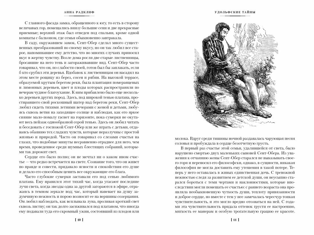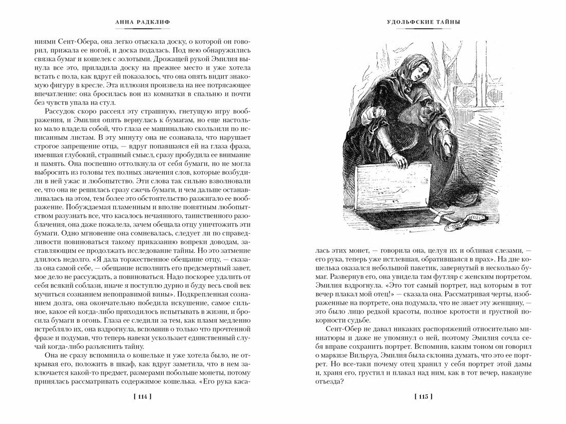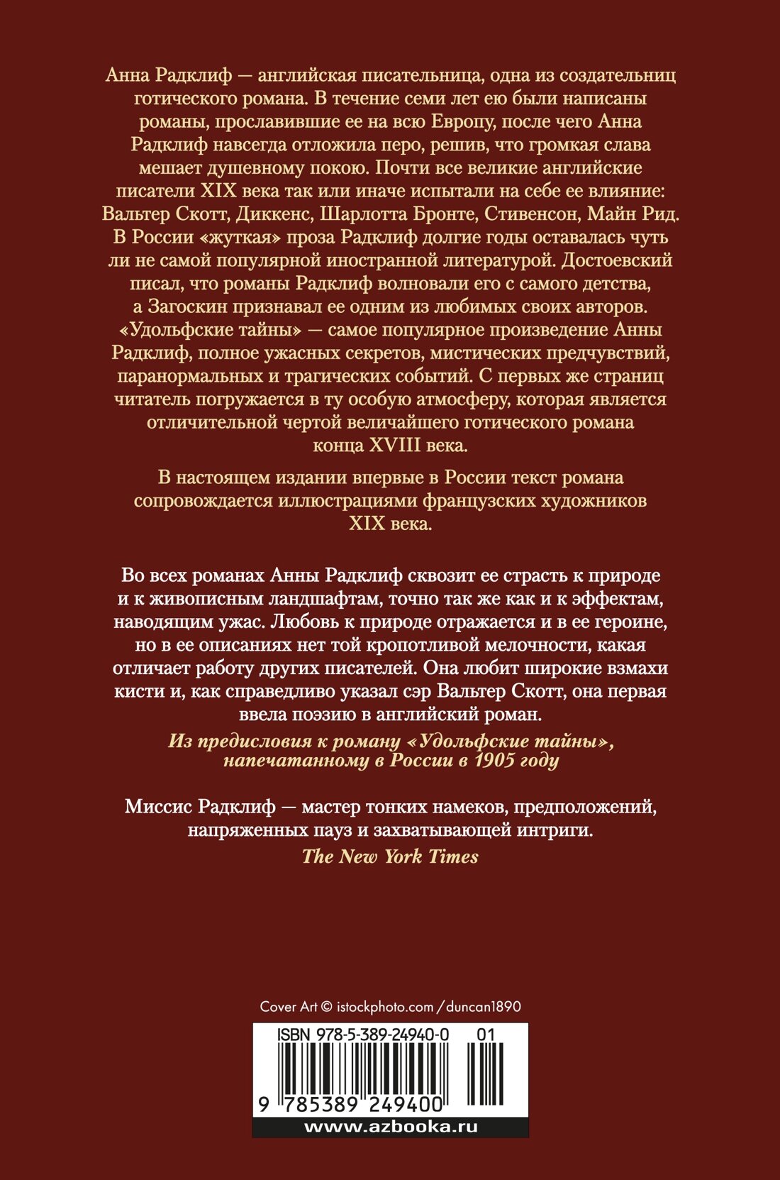 Анна Радклиф — английская писательница, одна из создательниц готического романа. В течение семи лет ею были написаны романы, прославившие ее на всю Европу, после чего Анна Радклиф навсегда отложила перо, решив, что громкая слава мешает душевному покою. Почти все великие английские писатели XIX века так или иначе испытали на себе ее влияние: Вальтер Скотт, Диккенс, Шарлотта Бронте, Стивенсон, Майн Рид. В России «жуткая» проза Радклиф долгие годы оставалась чуть ли не самой популярной иностранной литературой. Достоевский писал, что романы Радклиф волновали его с самого детства, а Загоскин признавал ее одним из любимых своих авторов. «Удольфские тайны» — самое популярное произведение Анны Радклиф, полное ужасных секретов, мистических предчувствий, паранормальных и трагических событий. С первых же страниц читатель погружается в ту особую атмосферу, которая является отличительной чертой величайшего готического романа конца XVIII века. В настоящем издании впервые в России текст романа сопровождается иллюстрациями французских художников XIX века.