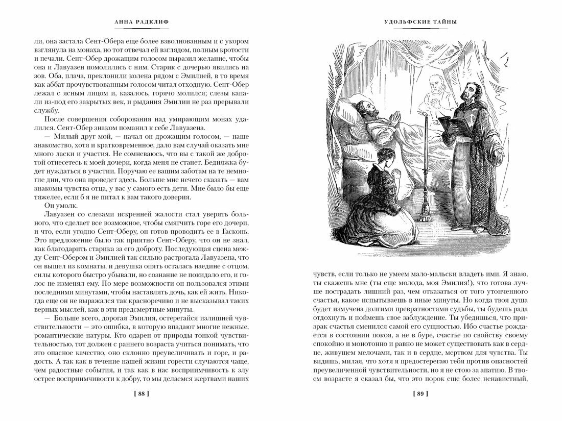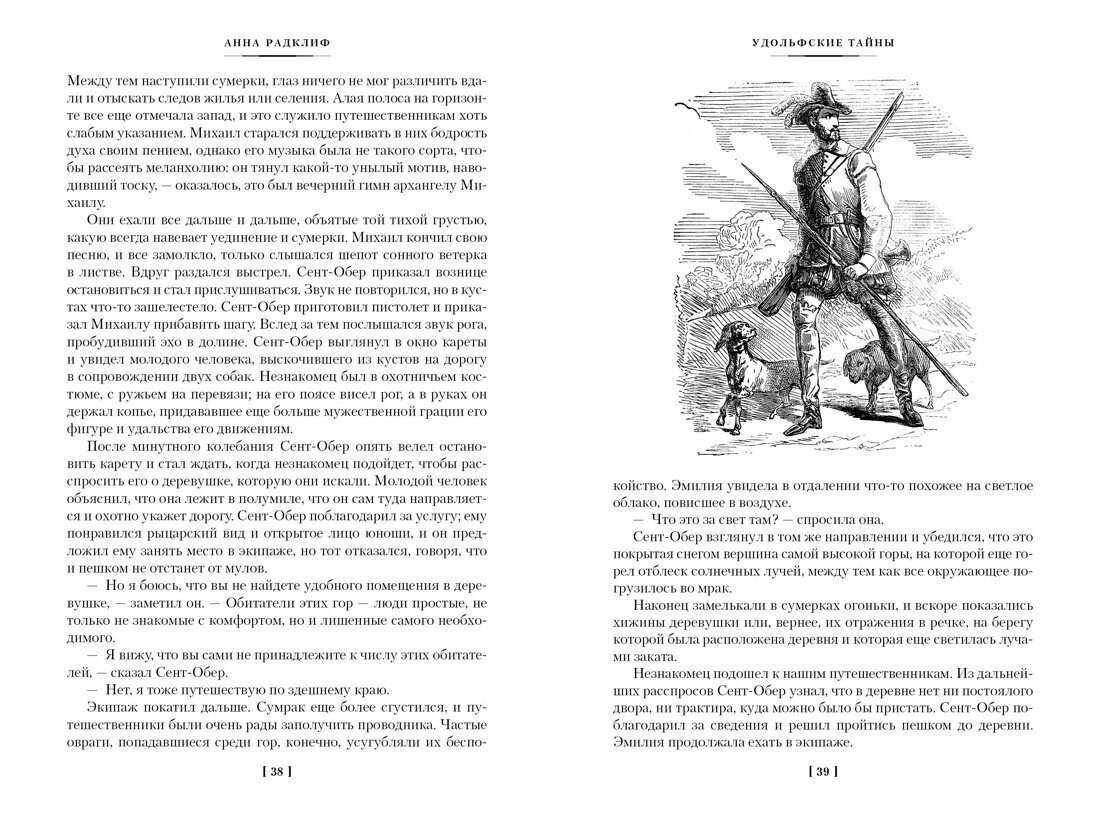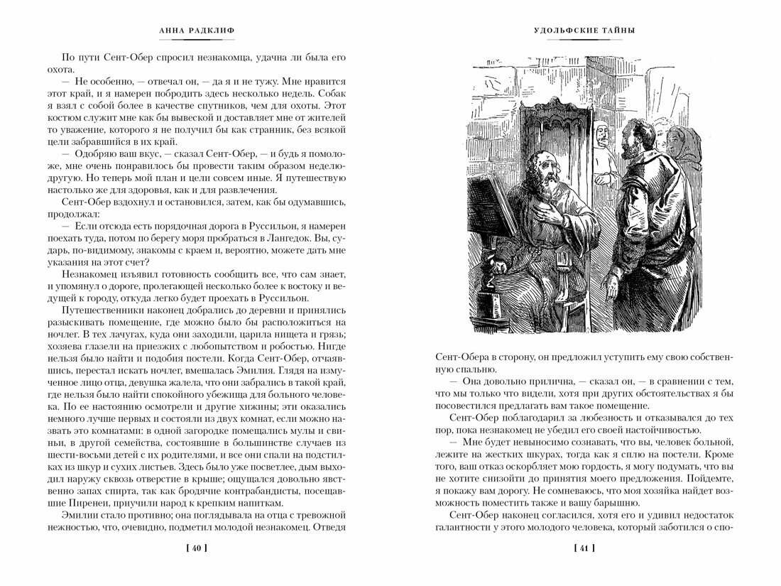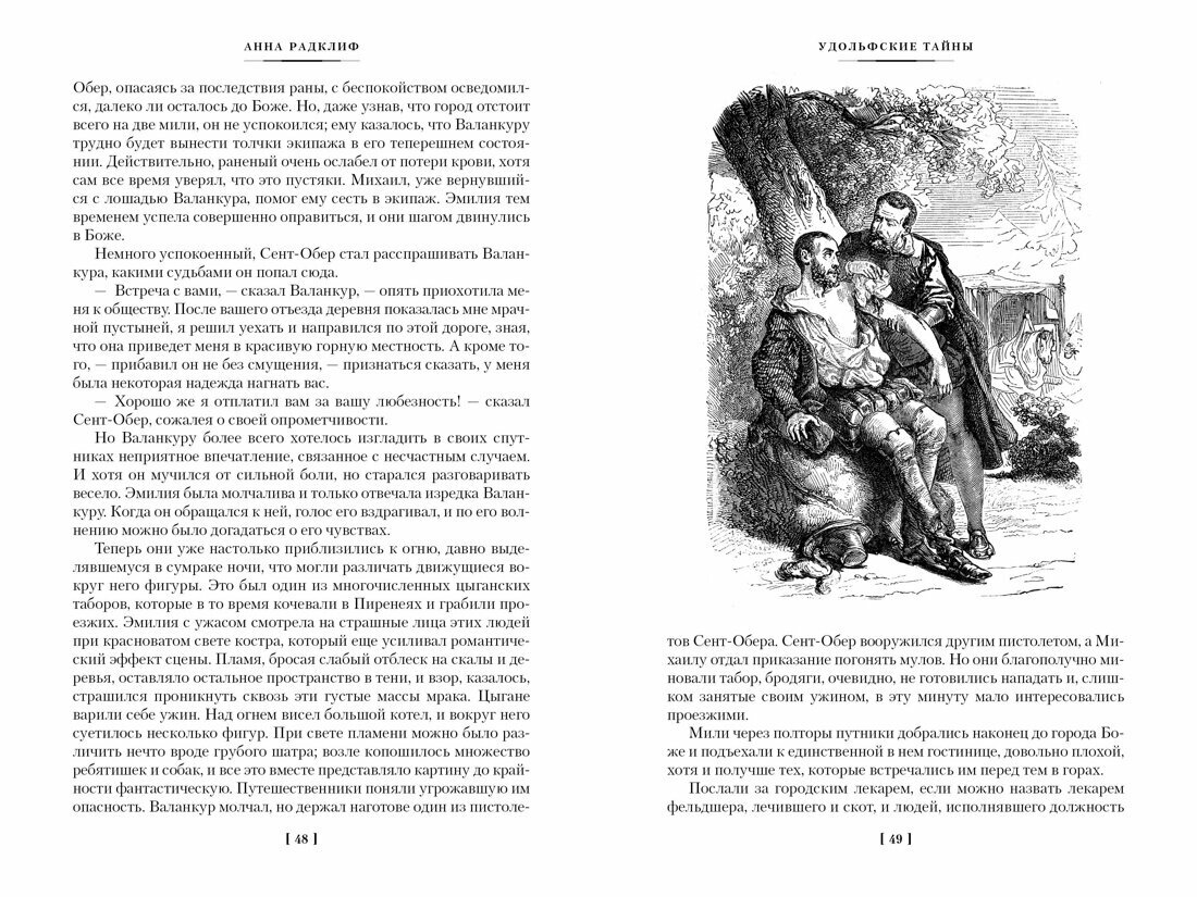 Анна Радклиф — английская писательница, одна из создательниц готического романа. В течение семи лет ею были написаны романы, прославившие ее на всю Европу, после чего Анна Радклиф навсегда отложила перо, решив, что громкая слава мешает душевному покою. Почти все великие английские писатели XIX века так или иначе испытали на себе ее влияние: Вальтер Скотт, Диккенс, Шарлотта Бронте, Стивенсон, Майн Рид. В России «жуткая» проза Радклиф долгие годы оставалась чуть ли не самой популярной иностранной литературой. Достоевский писал, что романы Радклиф волновали его с самого детства, а Загоскин признавал ее одним из любимых своих авторов. «Удольфские тайны» — самое популярное произведение Анны Радклиф, полное ужасных секретов, мистических предчувствий, паранормальных и трагических событий. С первых же страниц читатель погружается в ту особую атмосферу, которая является отличительной чертой величайшего готического романа конца XVIII века. В настоящем издании впервые в России текст романа сопровождается иллюстрациями французских художников XIX века.