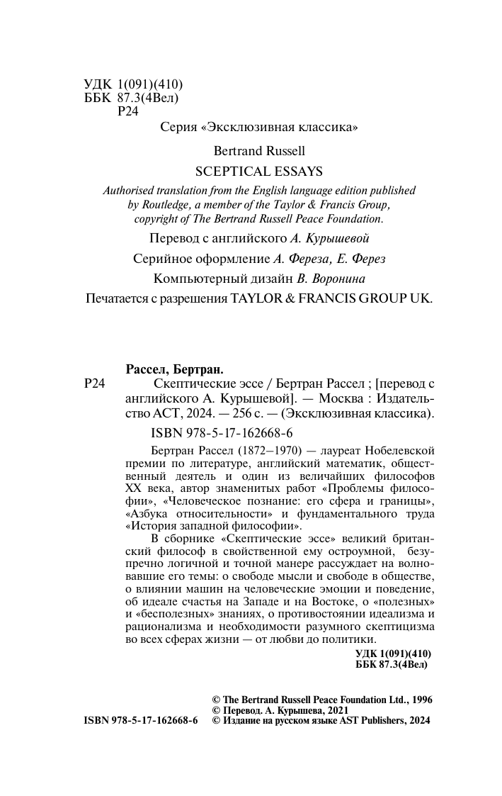 Бертран Рассел (1872–1970) – лауреат Нобелевской премии по литературе, английский математик, общественный деятель и один из величайших философов ХХ века, автор знаменитых работ «Проблемы философии», «Человеческое познание: его сфера и границы», «Азбука относительности» и фундаментального труда «История западной философии». В сборнике «Скептические эссе» великий британский философ в свойственной ему остроумной, безупречно логичной и точной манере рассуждает на волновавшие его темы: о свободе мысли и свободе в обществе, о влиянии машин на человеческие эмоции и поведение, об идеале счастья на Западе и на Востоке, о «полезных» и «бесполезных» знаниях, о противостоянии идеализма и рационализма и необходимости разумного скептицизма во всех сферах жизни — от любви до политики.