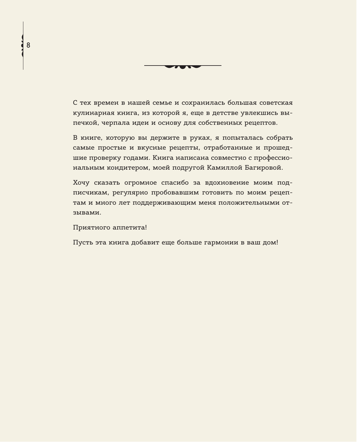 Эта книга — не просто сборник рецептов, она — настоящая сокровищница семейных ценностей, передаваемых из поколения в поколение. Здесь, между страницами, прячутся воспоминания автора о бабушке, маме и тех мгновениях, когда вся семья собиралась на кухне, чтобы вместе готовить и наслаждаться вкусом созданных творений.