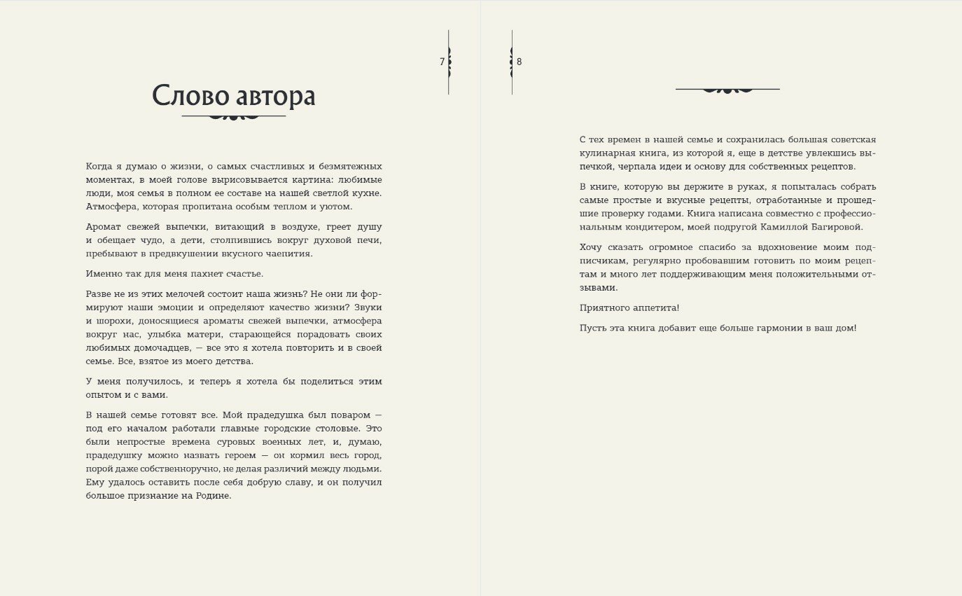 Каждый рецепт — это не только набор ингредиентов и инструкций, но и своеобразная маленькая история, созданная с любовью и заботой, а самое прекрасное заключается в том, что эти рецепты — ваша возможность создать новые воспоминания и уникальные моменты радости для своей семьи и друзей. Доверьтесь рецептам из этой книги и перенеситесь в атмосферу тепла и уюта, и пускай каждый момент вашей жизни будет таким же сладким, как и страницы этой книги!