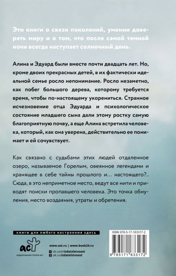 Алина и Эдуард были вместе почти двадцать лет. Но, кроме двоих прекрасных детей, в их фактически идеальной семье росло непонимание. Росло незаметно, как побег большого дерева, которому требуется время, чтобы по-настоящему укорениться. Странное исчезновение отца Эдуарда и психологическое состояние младшего сына дали этому ростку самую благоприятную почву, а еще Алина встретила человека, который, как она уверена, действительно ее понимает и ей сочувствует. Как связано с судьбами этих людей отдаленное озеро, называемое Горелым, овеянное легендами и хранящее в себе тайны прошлого и… настоящего?.. Сюда, в это неприметное место, ведут все нити и приводят поиски пропавшего человека. Это точка обнуления, место воздаяния, утраты и обретения.