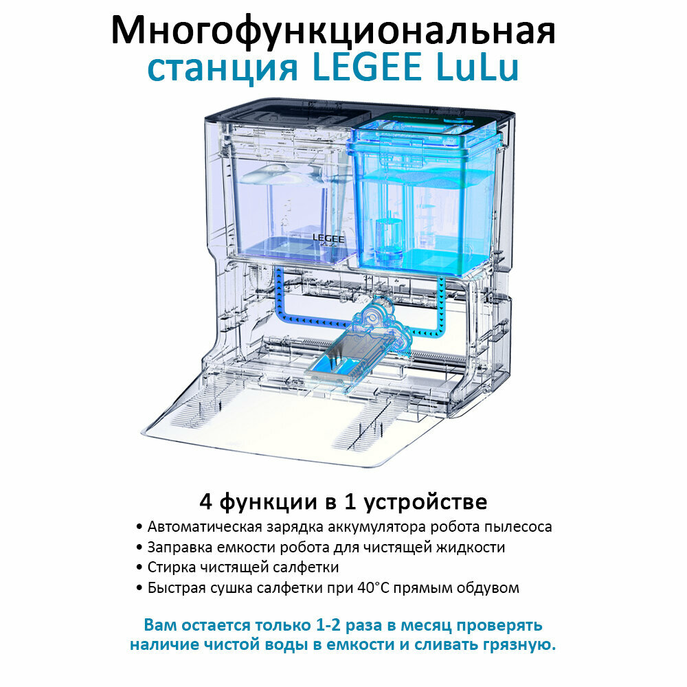 Станция самоочистки Hobot LEGEE LuLu для Legee D8 обеспечивает автоматическую зарядку аккумулятора робота-пылесоса, заправляет емкость робота чистящей жидкостью. Самостоятельно постирает и высушит чистящую салфетку. Вам остается только 1-2 раза в месяц проверять наличие чистой воды в емкости и сливать грязную.