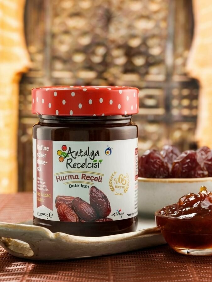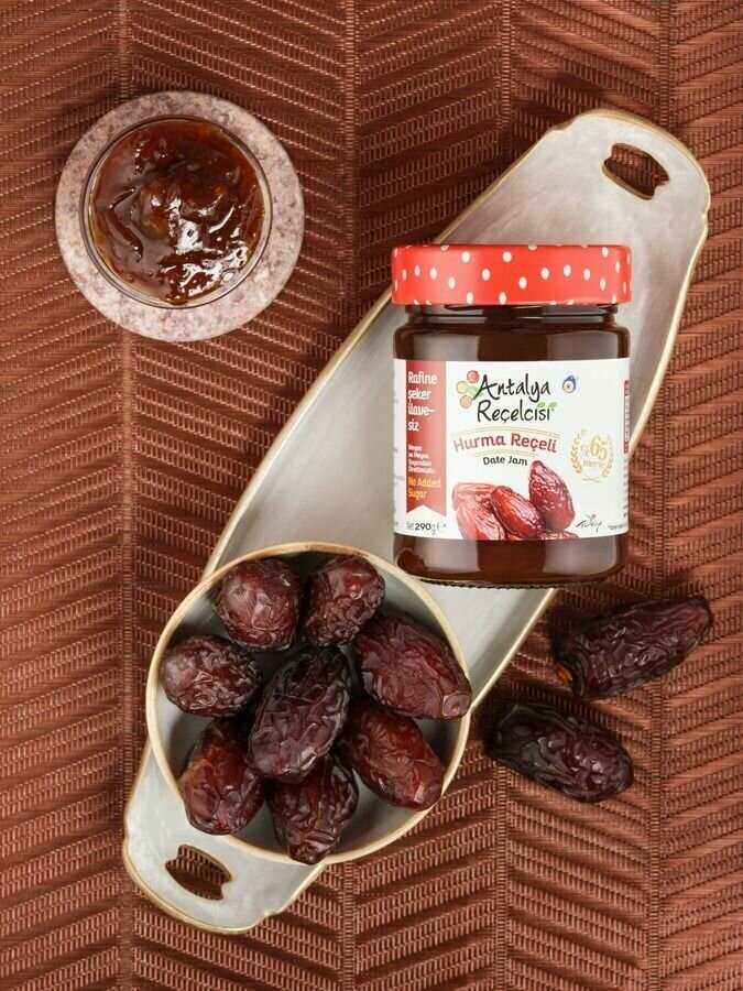 Варенье без сахара из фиников весом 290 грамм представлено в маленьких баночках. Варенье – это универсальный натуральный продукт, так как его можно добавить в творог, кашу, в мороженное, использовать как начинку в пирог или к блинам. Финиковое варенье содержит 65% фруктов, свежих и тщательно отобранных. Употребляя домашнее варенье, вы можете ощутить фруктовый вкус в полной мере.Варенье без сахара низкокалорийное подойдет для спортсменов и диабетиков. Также пп варенье можно использовать при похудении или при здоровом питании. Необычное варенье из Турции получается в результате сбора и переработки фруктов и овощей в период их полной зрелости. Все продукты готовятся в вакуумных котлах при температуре не более 60 градусов, что обеспечивает максимальное сохранение цвета, вкуса и аромата. Также варенье имеет полезные свойства: укрепление иммунитета, поднятие настроения, противодействие простудным заболеваниям. Варенье поможет согреться в холодную погоду и будет вкусным лакомством к чаепитию с родными и близкими. Варенье не содержит ароматизаторов, красителей, усилителей вкуса и ГМО. 100% натуральный продукт. Antalya Recelcisi - популярный бренд во многих странах. Вы можете порадовать любимых, включив варенье в подарочный набор.