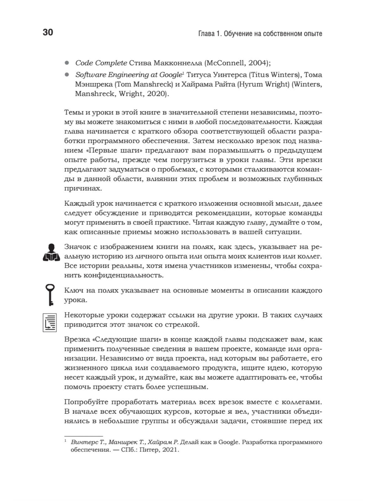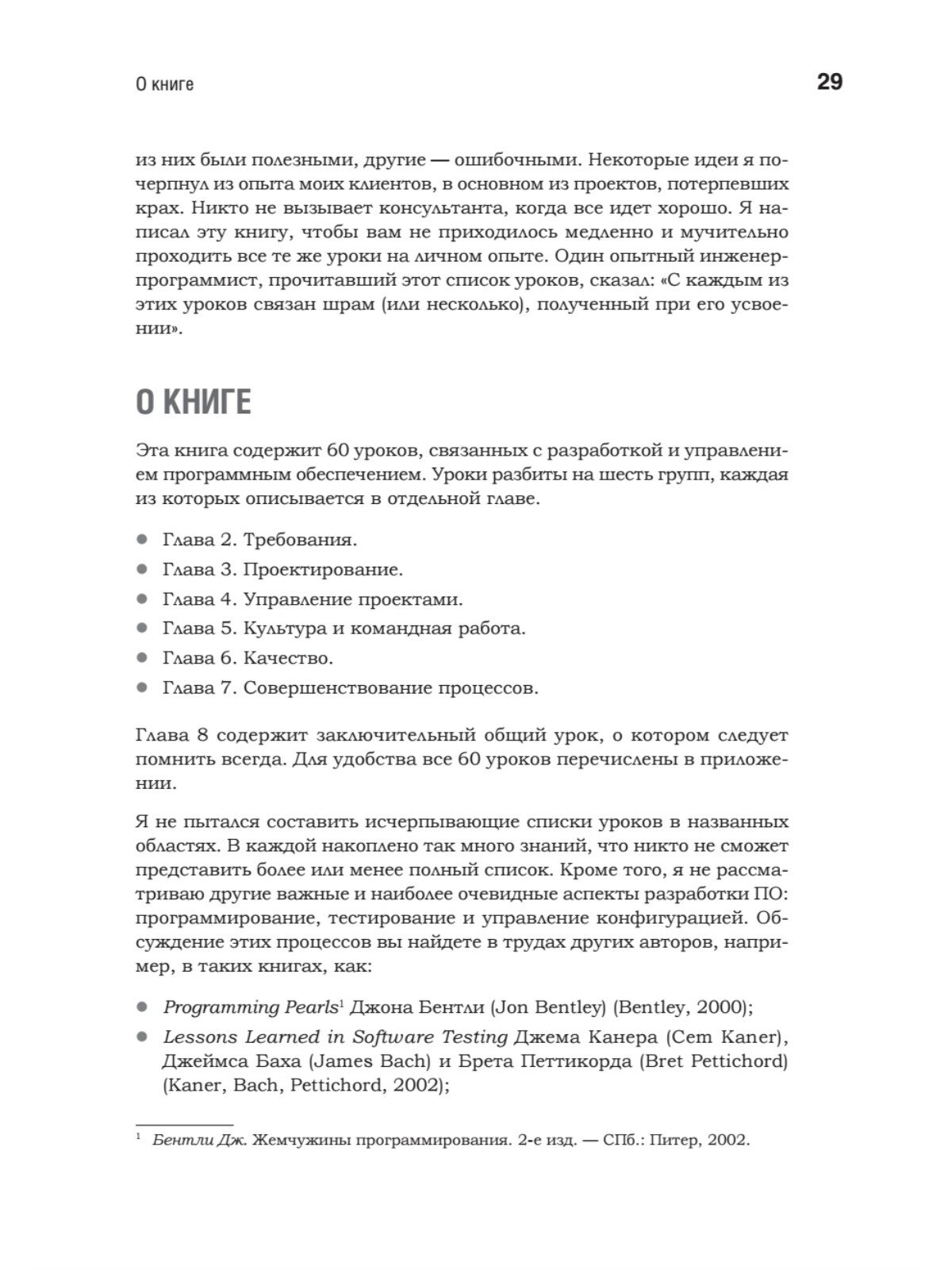 Совершенное программное обеспечение невозможно создать без изучения накопленного опыта.Опыт — главный учитель, но медленный и нередко болезненный. Но зачем же нам повторять ошибки? Книга «Жемчужины разработки» поможет совершенствоваться быстрее и избежать многих проблем, обучаясь на опыте других людей, которые уже поднялись по кривой обучения. Карл Вигерс сформулировал 60 кратких практических уроков, которые подойдут для любых проектов, независимо от роли, отрасли, технологии или методологии.Идеи и конкретные рекомендации охватывают шесть важнейших элементов успеха: требования, дизайн, управление проектами, культуру и командную работу, качество и совершенствование процессов. Для каждого из направлений Вигерс предлагает «первые шаги», позволяющие осмыслить собственный опыт, уроки с основными идеями, реальными примерами и действенными решениями и «следующие шаги» для внедрения опыта в вашем проекте, команде или организации. Эти знания нельзя получить в университете!