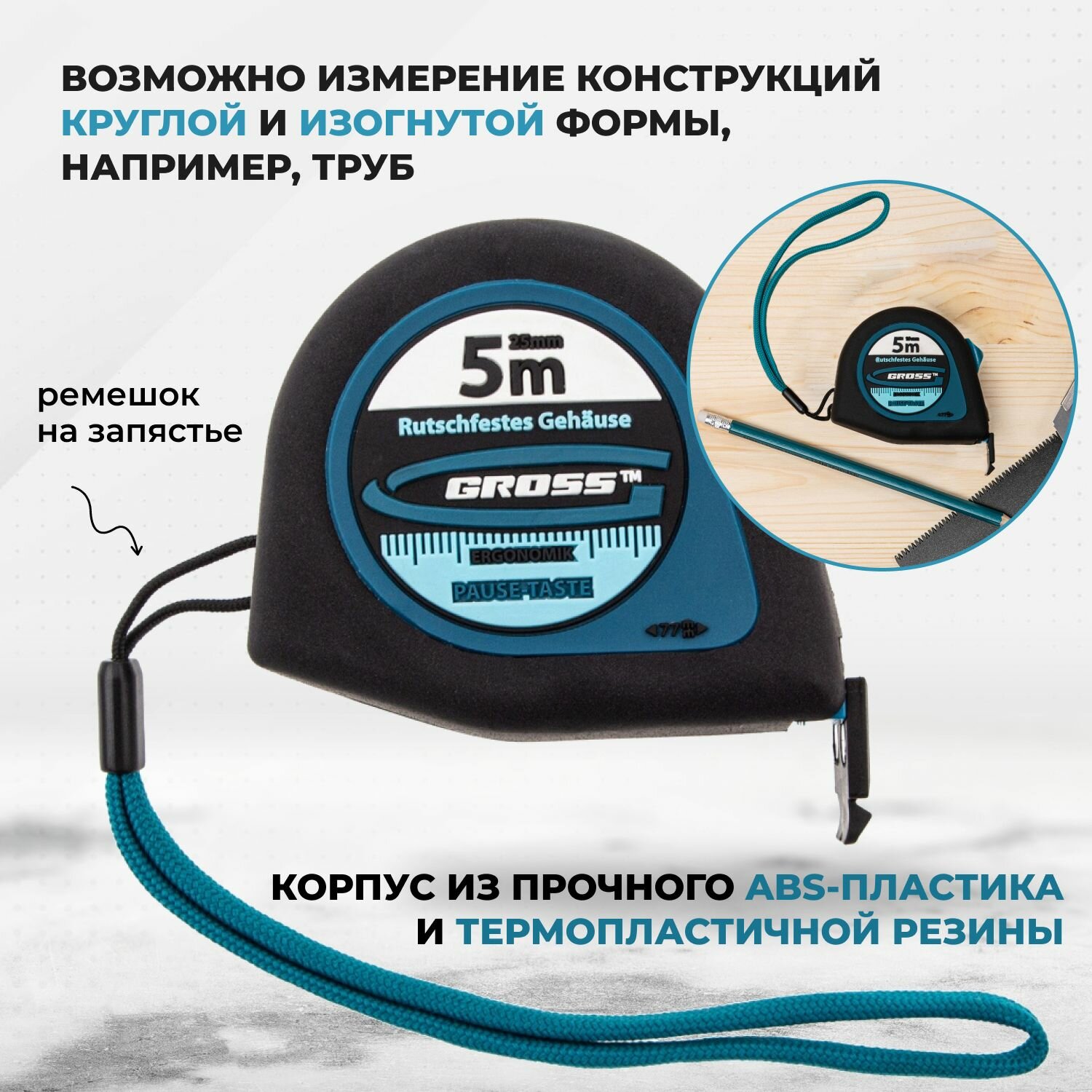Рулетка Ergonomisch торговой марки GROSS с длиной ленты 5 м. Эргономичный корпус рулетки выполнен из ABS-пластика (используется сырье BASF), который сохраняет работоспособность механизма при падении с высоты до 1,5 м. Измерительное полотно рулетки шириной 25 мм обладает высокими упругими свойствами, что позволяет производить измерения в труднодоступных местах. Основание измерительного полотна оснащено обрезиненным магнитным зацепом True Zero (истинный ноль), который обеспечивает фиксацию не только на ровных, но и на округлых поверхностях (например, на трубах). Зацеп True Zero позволяет более точно производить замеры от нуля при внешних/внутренних замерах.