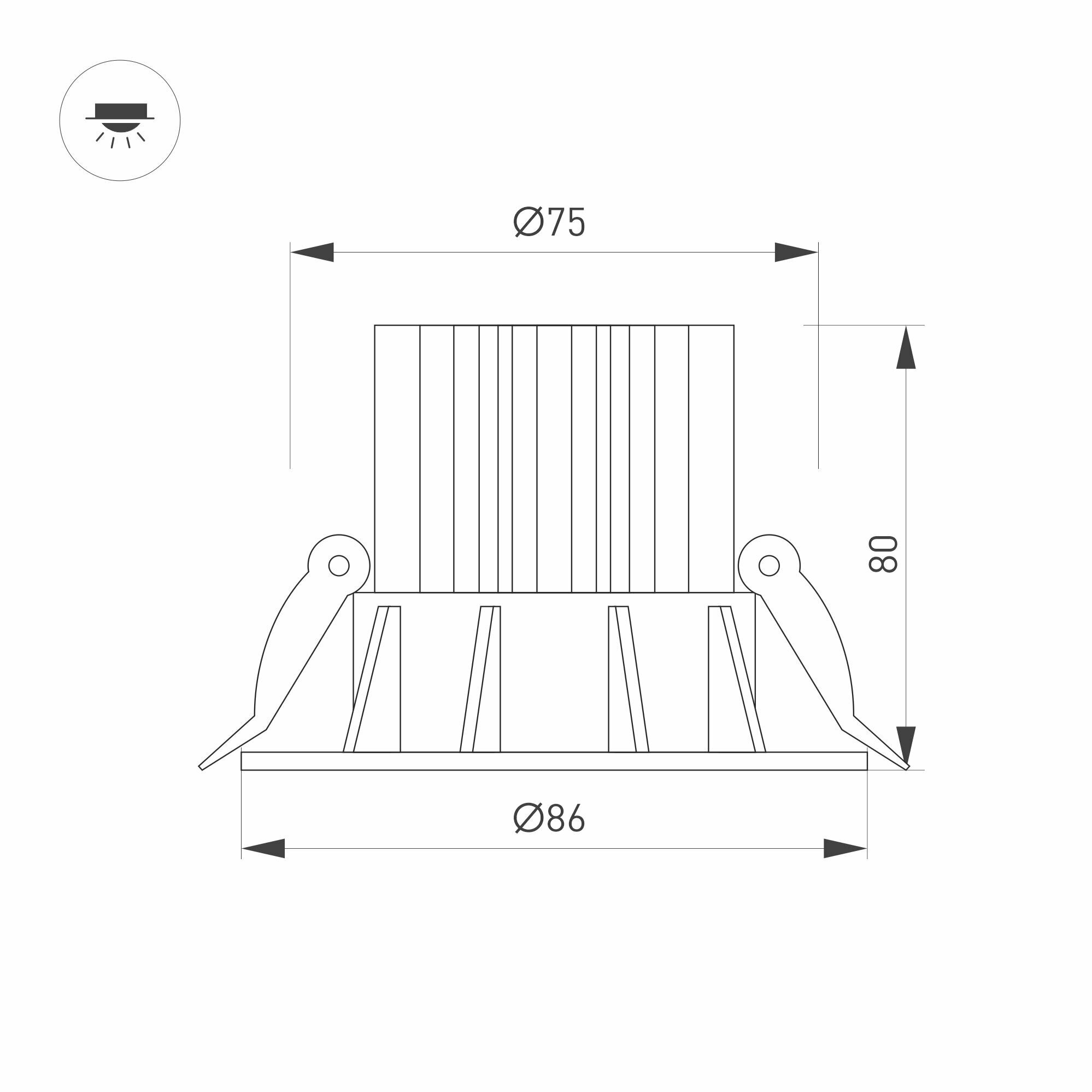 Встраиваемый светильник даунлайт. Мощность 10 Вт, св. поток 750 лм, 75 лм/Вт, теплый 3000 K, CRI>90, угол 36°, напряжение питания 230 В. Белый круглый корпус из алюминия, экран PMMA, степень защиты IP54. Размер: диаметр 85 мм, высота 80 мм. Монтаж встраиваемый, установочное отверстие: диаметр 75 мм. Драйвер 20-40 В, 250 мА, пульсация
