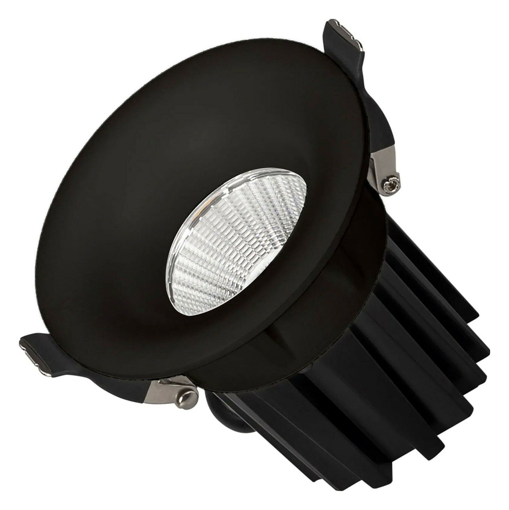 Встраиваемый светильник даунлайт. Мощность 10 Вт, св. поток 880 лм, 88 лм/Вт, дневной 4000 K, CRI>90, угол 60°, напряжение питания 230 В. Черный круглый корпус из алюминия, экран PMMA, степень защиты IP54. Размер: диаметр 86 мм, высота 80 мм. Монтаж встраиваемый, установочное отверстие: диаметр 75 мм. Драйвер 20-40 В, 250 мА, пульсация