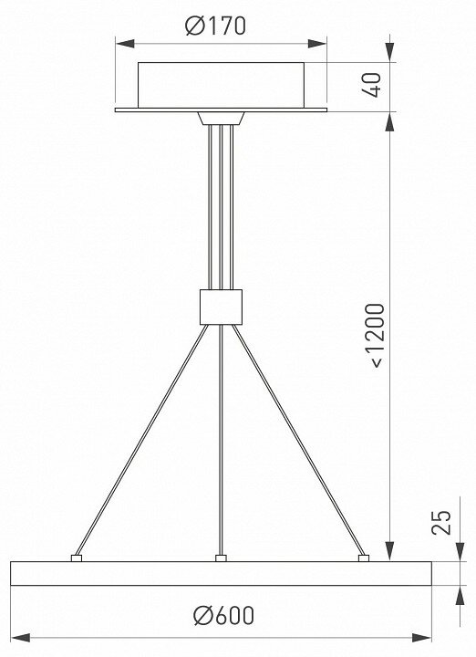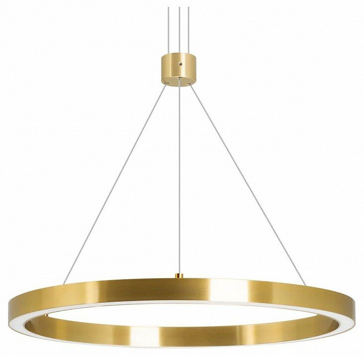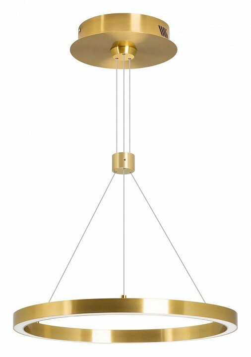 Подвесной светильник. Мощность 36 Вт, св. поток 2050 лм, 57 лм/Вт, теплый 3000 K, CRI>90, угол 120°, напряжение питания 230 В. Золотистый круглый корпус из алюминия, экран силикон, степень защиты IP20. Размер: диаметр 600 мм, высота 25 мм, ширина профиля 25 мм, размер чаши: диаметр 170 мм, высота 40 мм. Монтаж подвесной, длина подвеса 1200мм. Пульсация