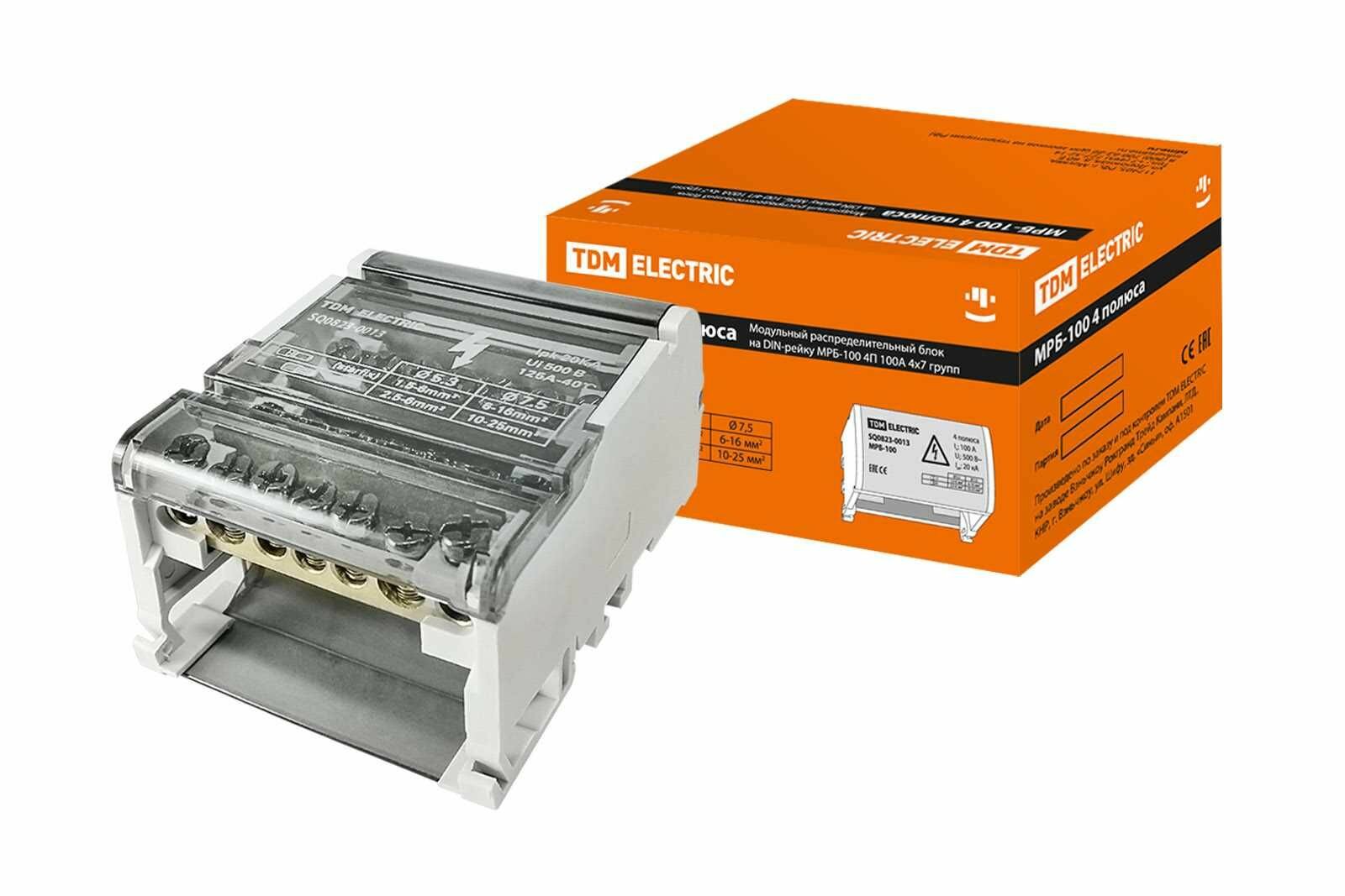 Дополнительные технические характеристики модульного распределительного блока на DIN-рейку TDM МРБ-100 4П 100А 4x7 групп :Назначение - для создания компактных распределительных узлов на токи до 125 А в электрических шкафах и щитах с номинальным током от 250 до 2500 A.Контактная группа шин изготовлена из латуни с содержанием меди не менее 57%.Прижимные винты изготовлены из оцинкованной стали.Материал изоляторов - армированный стекловолокном пластик.Шины закреплены в корпусе, который имеет возможность крепления на DIN-рейку 35 мм.Каждая шина отдельно изолирована.Передний защитный экран обеспечивает защиту от прикосновений.Возможность установки различными способами - на монтажную DIN-рейку 35 мм или на панель щита 2-мя винтами.