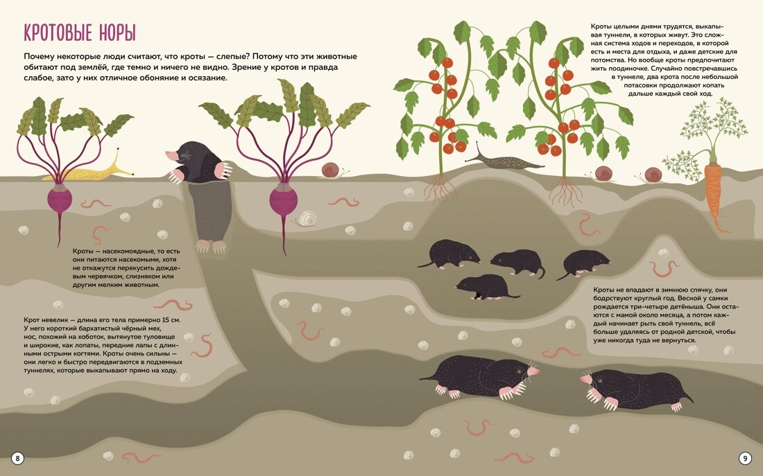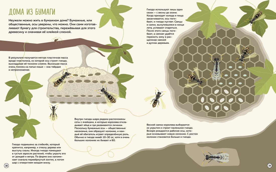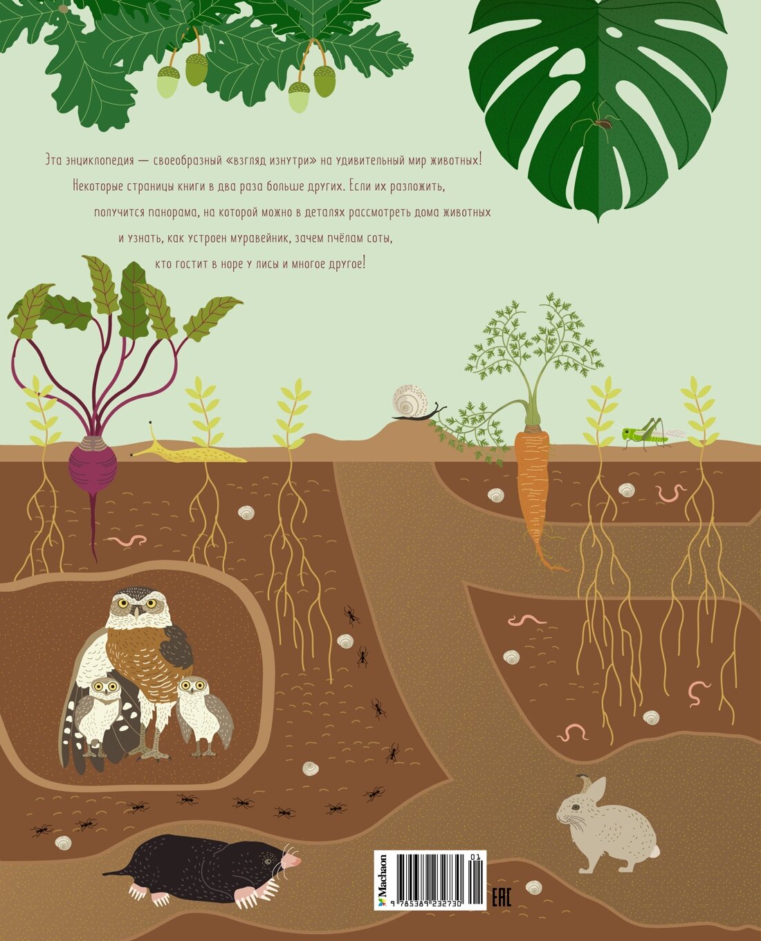 Эта энциклопедия — своеобразный «взгляд изнутри» на удивительный мир животных! Некоторые страницы книги в два раза больше других. Если их разложить, получится панорама, на которой можно в деталях рассмотреть дома животных и узнать, как устроен муравейник, зачем пчёлам соты, кто гостит в норе у лисы и многое другое!