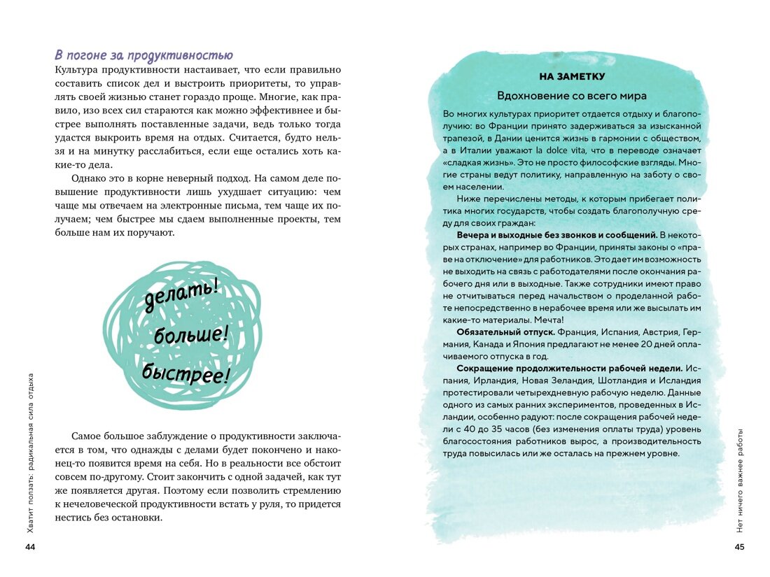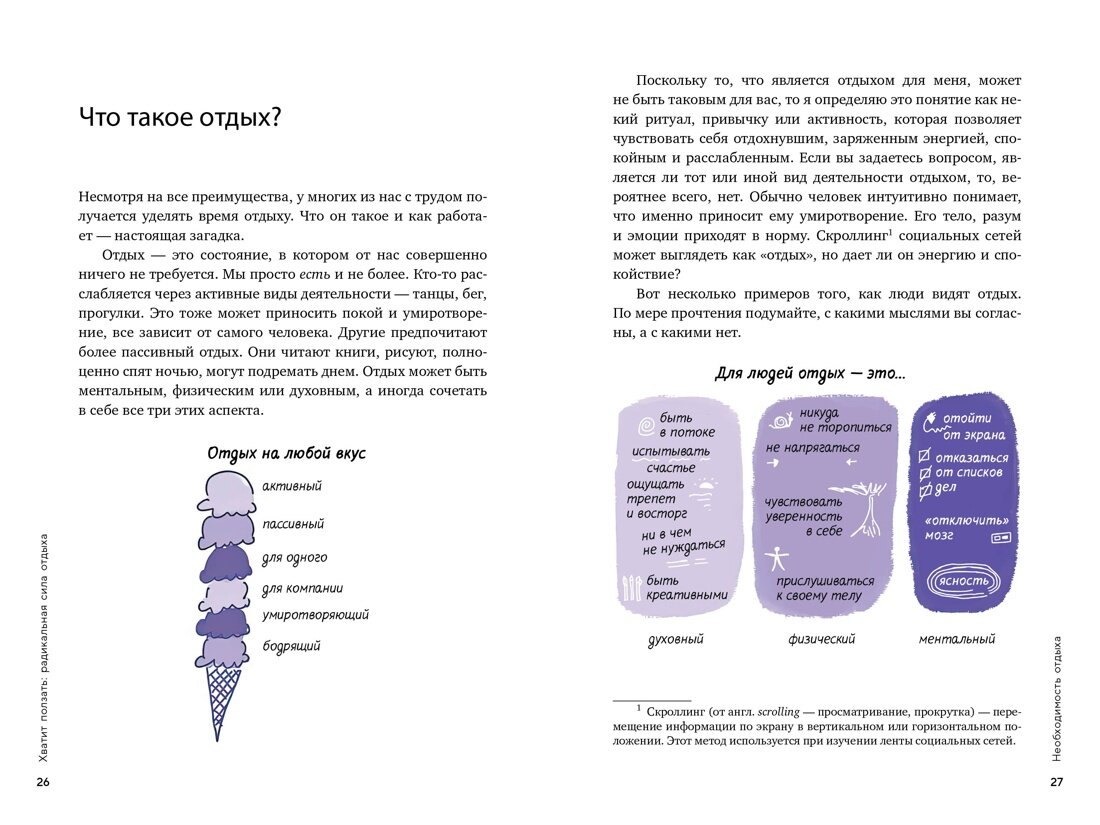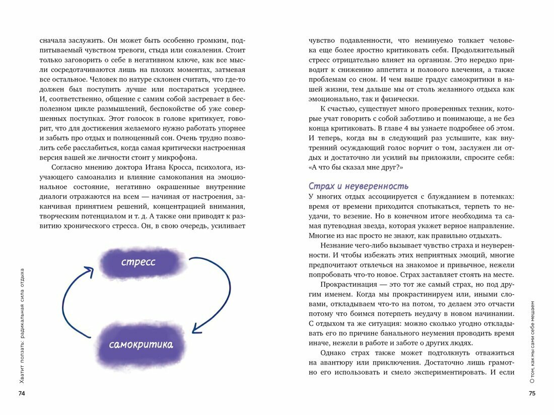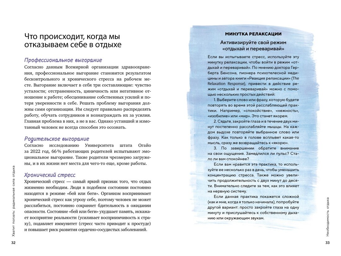 Как вы чувствуете себя в мире, где успех определяется тем, насколько выше своей головы вы сможете прыгнуть сегодня? И завтра, и каждый день после этого? Попробуем угадать: эмоционально истощенным, хронически усталым и начисто лишенным желания что-либо делать. Более того, скорее всего вам не помогают ни вечер за просмотром сериалов, ни заедание негатива печеньками. Вы ищете возможность отдохнуть ПО-НАСТОЯЩЕМУ, но просто не знаете как. Так что же делать? Эксперт по практикам эффективной релаксации Химена Венгоэчиа точно знает ответ. В этой книге она познакомит вас с десятками проверенных методов расслабления и восстановления, объяснит, какие полезные привычки завести, а от каких паттернов – отказаться, и поможет найти баланс между работой и отдыхом, чтобы избежать выгорания в будущем. Доступные для каждого, эти практики помогут снизить общий уровень стресса, освободиться от постоянной тревоги и восстановить запас энергии. Ощутите на себе радикальную силу отдыха и расправьте крылья!