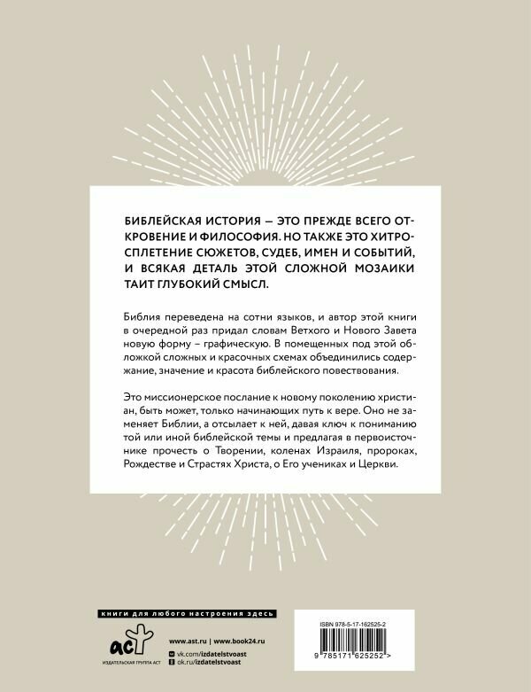 Библейская история - это, прежде всего, откровение и философия. Но также это хитросплетение сюжетов, судеб, имен и событий, и всякая деталь этой сложной мозаики таит глубокий смысл. Библия переведена на сотни языков, и авторы этой книги в очередной раз придали словам Ветхого и Нового Заветов новую форму - графическую. В помещенных под этой обложкой сложных и красочных схемах объединились содержание, значение и красота библейского повествования. Это миссионерское послание к новому поколению христиан, быть может, только начинающих путь к вере. Оно не заменяет Библии, а отсылает к ней, давая ключ к пониманию той или иной библейской темы и предлагая в первоисточнике прочесть о Творении, коленах Израиля, пророках, Рождестве и Страстях Христа, о Его учениках и Церкви.