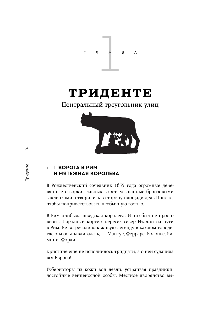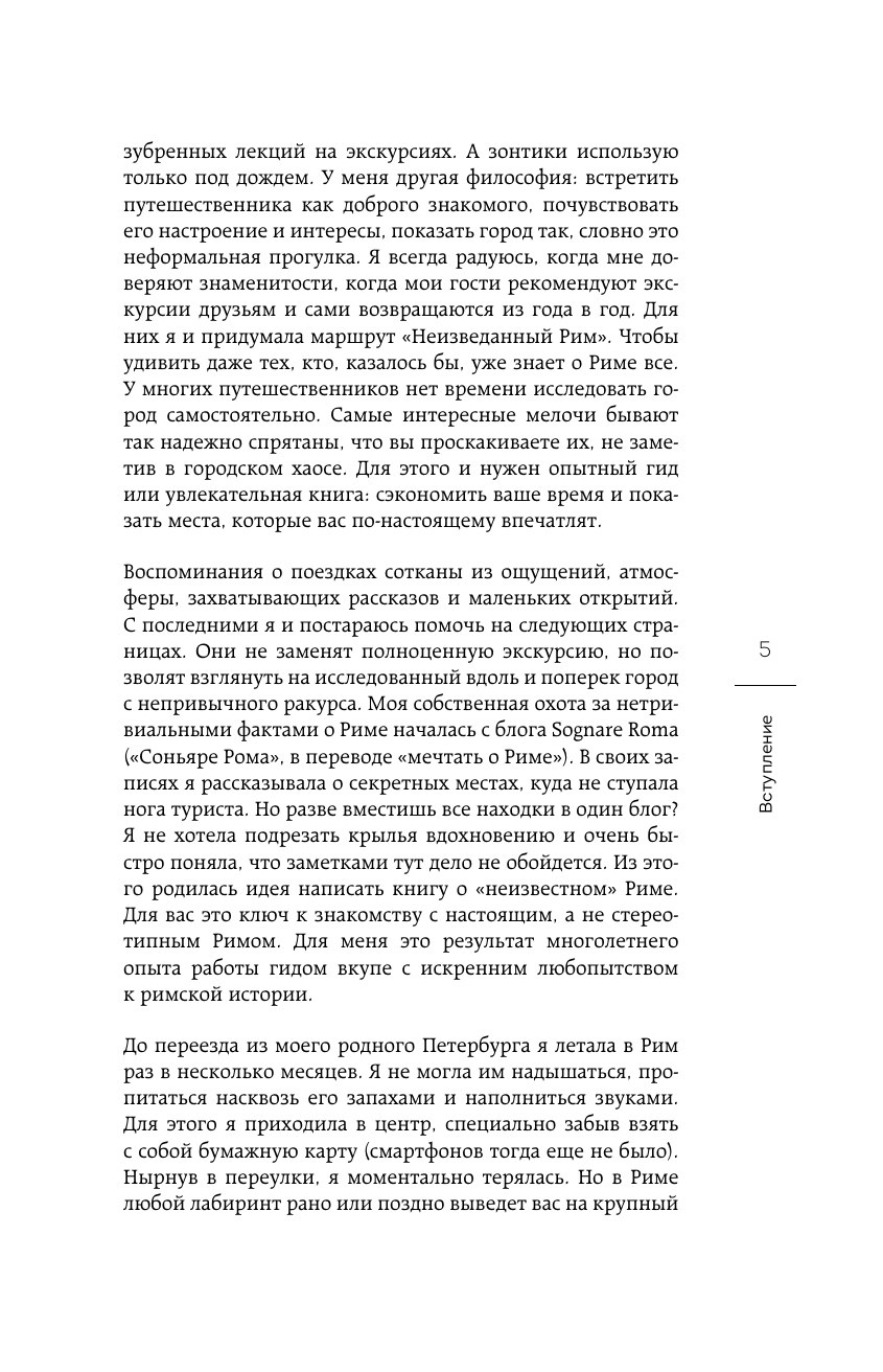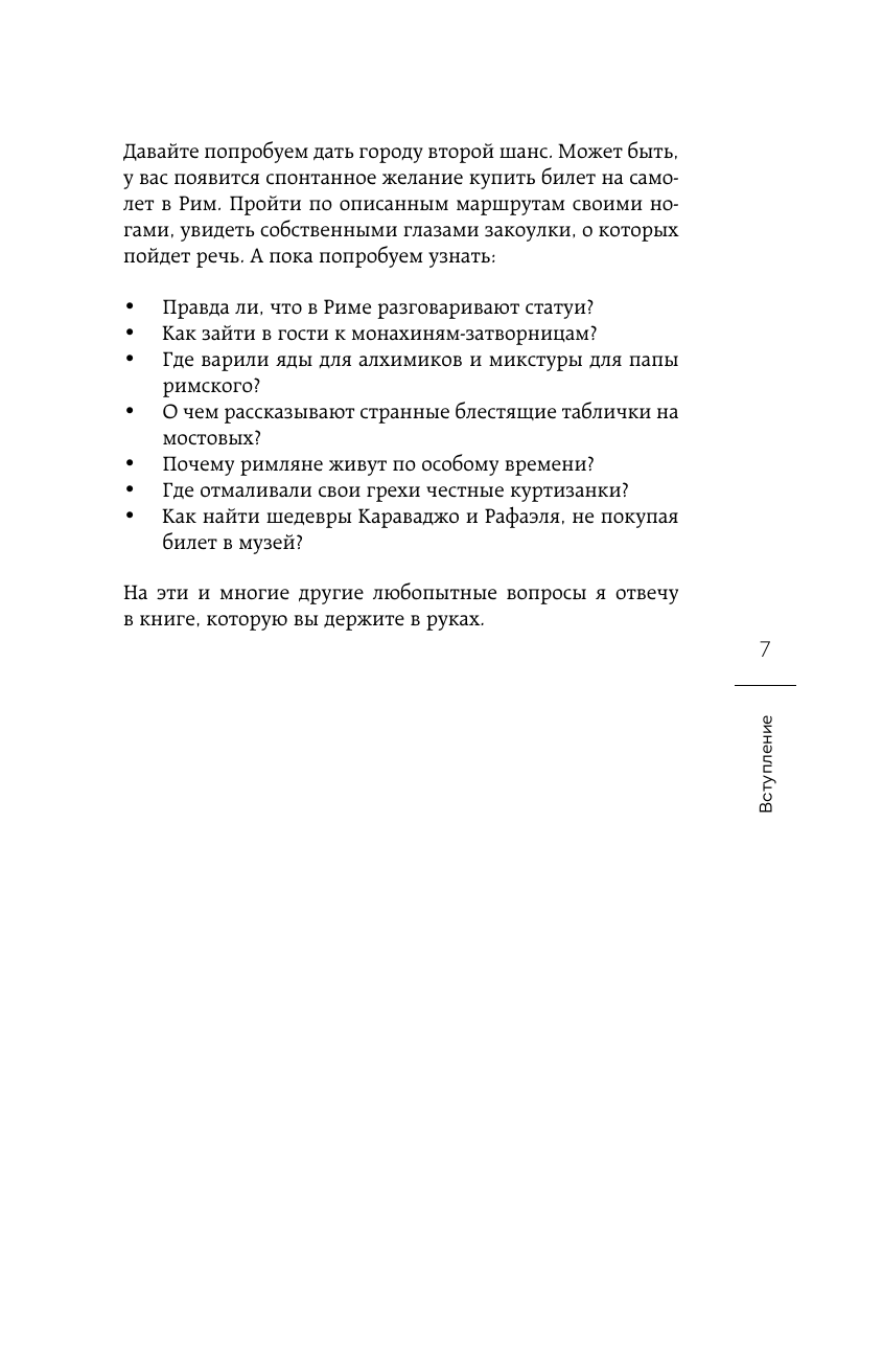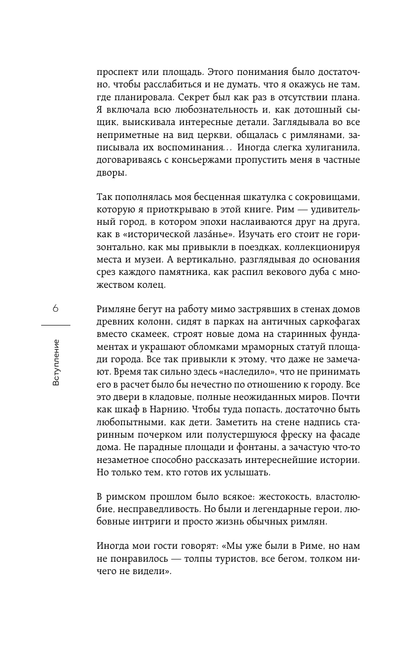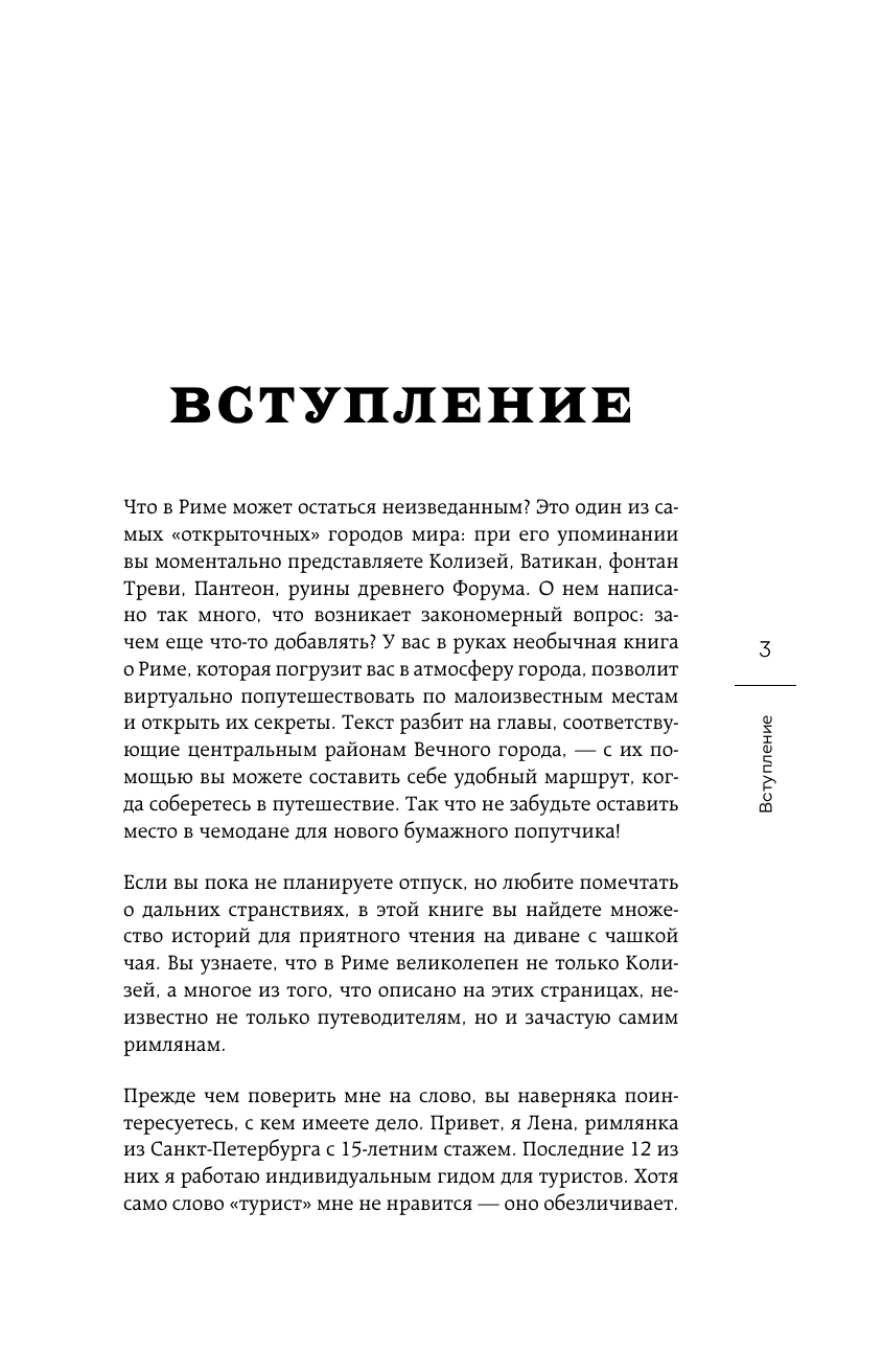Елена Елохина — «римлянка в душе» — родом из Санкт-Петербурга, бакалавр и магистр СПбГУ и университета La Sapienza, профессиональный гид в Риме и Ватикане. Живет в Вечном городе более 15 лет и отлично знает местную культуру и язык. Она ведет популярный блог о Риме, где рассказывает о неизвестных местах города. Книга написана на основе ее опыта и экскурсий, которые она проводит для индивидуальных путешественников. Рим — удивительныи? город, в котором эпохи наслаиваются друг на друга, как в «историческои? лазанье». Изучать его стоит не горизонтально, как мы привыкли в поездках, коллекционируя места и музеи. А вертикально, разглядывая срез каждого памятника, как распил векового дуба с множеством колец. Римляне бегут на работу мимо застрявших в стенах домов древних колонн, сидят в парках на античных саркофагах вместо скамеек, строят новые дома на старинных фундаментах и украшают обломками мраморных статуи? площади города. Все так привыкли к этому, что даже не замечают. Время здесь сильно «наследило», что не принимать его в расчет было бы нечестно по отношению к городу. Все это двери в кладовые, полные неожиданных миров. Почти как шкаф в Нарнию. Чтобы туда попасть, достаточно быть любопытными, как дети. Заметить на стене старинную надпись или практически стертую фреску на фасаде дома. Не парадные площади и фонтаны, а зачастую что-то незаметное способно рассказать интереснеи?шую историю. Но только тем, кто готов ее услышать. • Правда ли, что в Риме разговаривают статуи? • Как заи?ти в гости к монахиням-затворницам? • Где варили яды для алхимиков и микстуры для папы римского? • Где отмаливали свои грехи честные куртизанки? • Как наи?ти шедевры Караваджо и Рафаэля, не покупая билет в музеи?? Ответы на все эти и многие другие неожиданные вопросы вы найдете в книге, которую держите в руках!