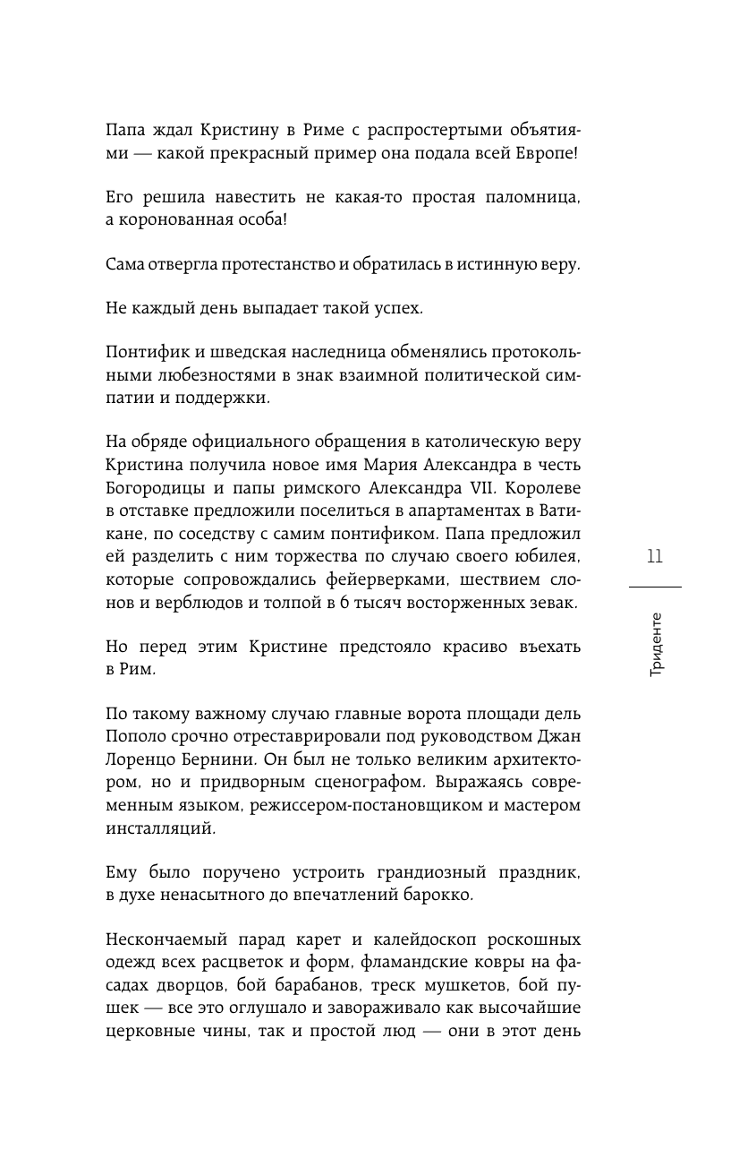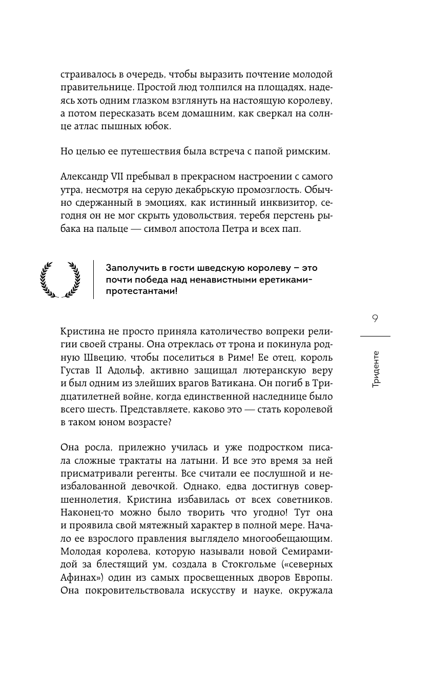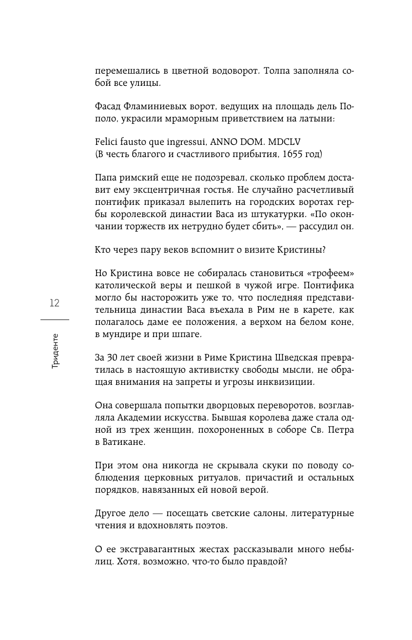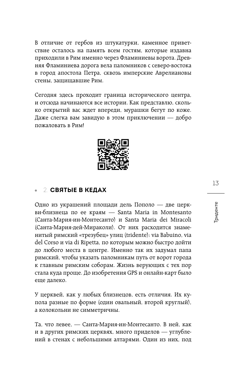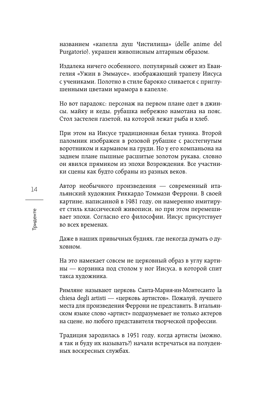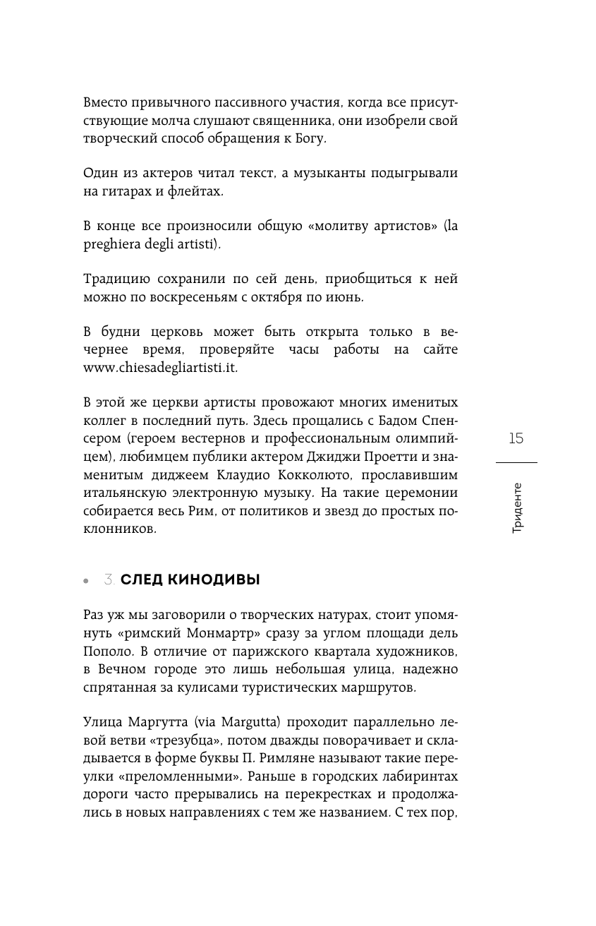 Елена Елохина — «римлянка в душе» — родом из Санкт-Петербурга, бакалавр и магистр СПбГУ и университета La Sapienza, профессиональный гид в Риме и Ватикане. Живет в Вечном городе более 15 лет и отлично знает местную культуру и язык. Она ведет популярный блог о Риме, где рассказывает о неизвестных местах города. Книга написана на основе ее опыта и экскурсий, которые она проводит для индивидуальных путешественников. Рим — удивительныи? город, в котором эпохи наслаиваются друг на друга, как в «историческои? лазанье». Изучать его стоит не горизонтально, как мы привыкли в поездках, коллекционируя места и музеи. А вертикально, разглядывая срез каждого памятника, как распил векового дуба с множеством колец. Римляне бегут на работу мимо застрявших в стенах домов древних колонн, сидят в парках на античных саркофагах вместо скамеек, строят новые дома на старинных фундаментах и украшают обломками мраморных статуи? площади города. Все так привыкли к этому, что даже не замечают. Время здесь сильно «наследило», что не принимать его в расчет было бы нечестно по отношению к городу. Все это двери в кладовые, полные неожиданных миров. Почти как шкаф в Нарнию. Чтобы туда попасть, достаточно быть любопытными, как дети. Заметить на стене старинную надпись или практически стертую фреску на фасаде дома. Не парадные площади и фонтаны, а зачастую что-то незаметное способно рассказать интереснеи?шую историю. Но только тем, кто готов ее услышать. • Правда ли, что в Риме разговаривают статуи? • Как заи?ти в гости к монахиням-затворницам? • Где варили яды для алхимиков и микстуры для папы римского? • Где отмаливали свои грехи честные куртизанки? • Как наи?ти шедевры Караваджо и Рафаэля, не покупая билет в музеи?? Ответы на все эти и многие другие неожиданные вопросы вы найдете в книге, которую держите в руках!