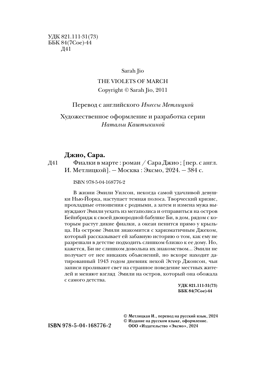 В жизни Эмили Уилсон, некогда самой удачливой девушки Нью-Йорка, наступает темная полоса. Творческий кризис, прохладные отношения с родными, а затем и измена мужа вынуждают Эмили уехать из мегаполиса и отправиться на остров Бейнбридж к своей двоюродной бабушке Би, в дом, рядом с которым растут дикие фиалки, а океан пенится прямо у крыльца. На острове Эмили знакомится с харизматичным Джеком, который рассказывает ей забавную историю о том, как ему не разрешали в детстве подходить слишком близко к ее дому. Но, кажется, Би не слишком довольна их знакомством... Эмили не получает от нее никаких объяснений, но вскоре находит датированный 1943 годом дневник некой Эстер Джонсон, чьи записи проливают свет на странное поведение местных жителей и меняют взгляд Эмили на остров, который она обожала с самого детства. Сара Джио — одна из самых известных авторов романтической прозы. Ее знают и любят миллионы читателей в России. Роман «Фиалки в марте» — дебютная книга Сары Джио, которая принесла ей мировую известность.