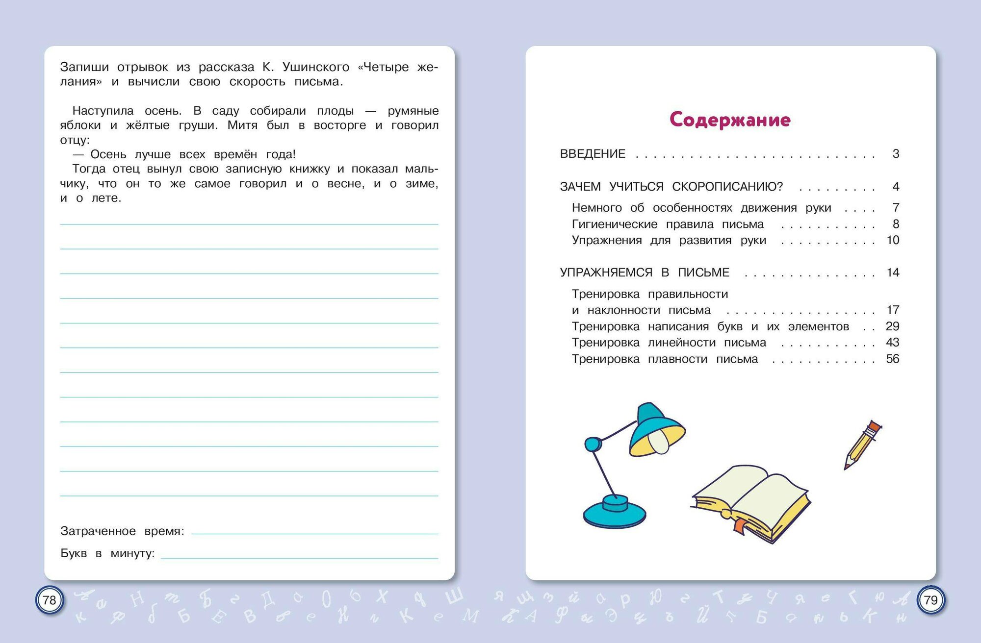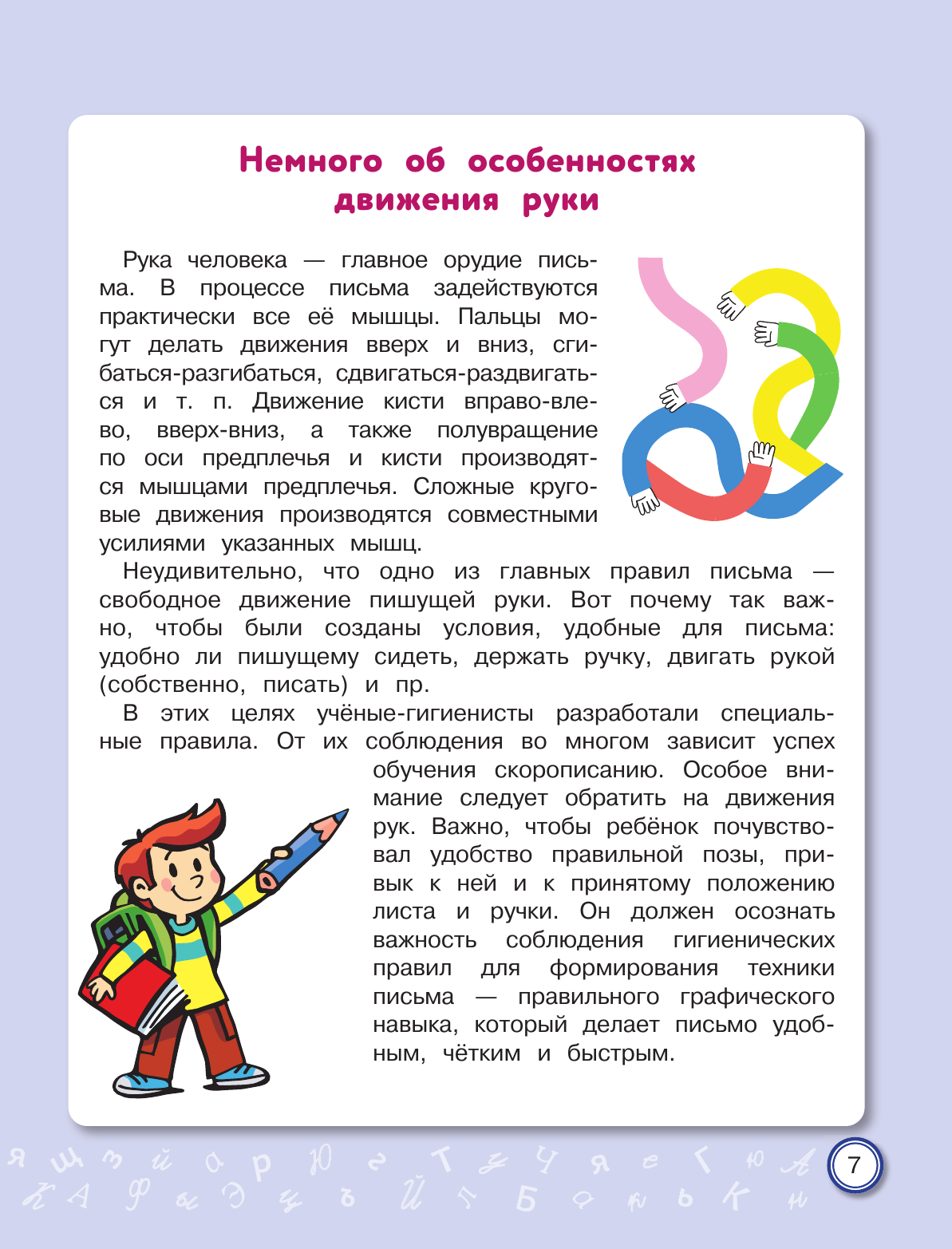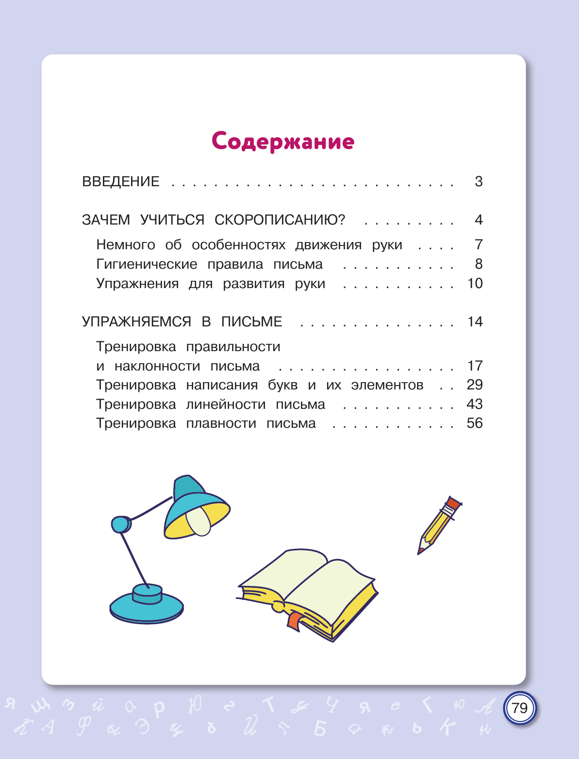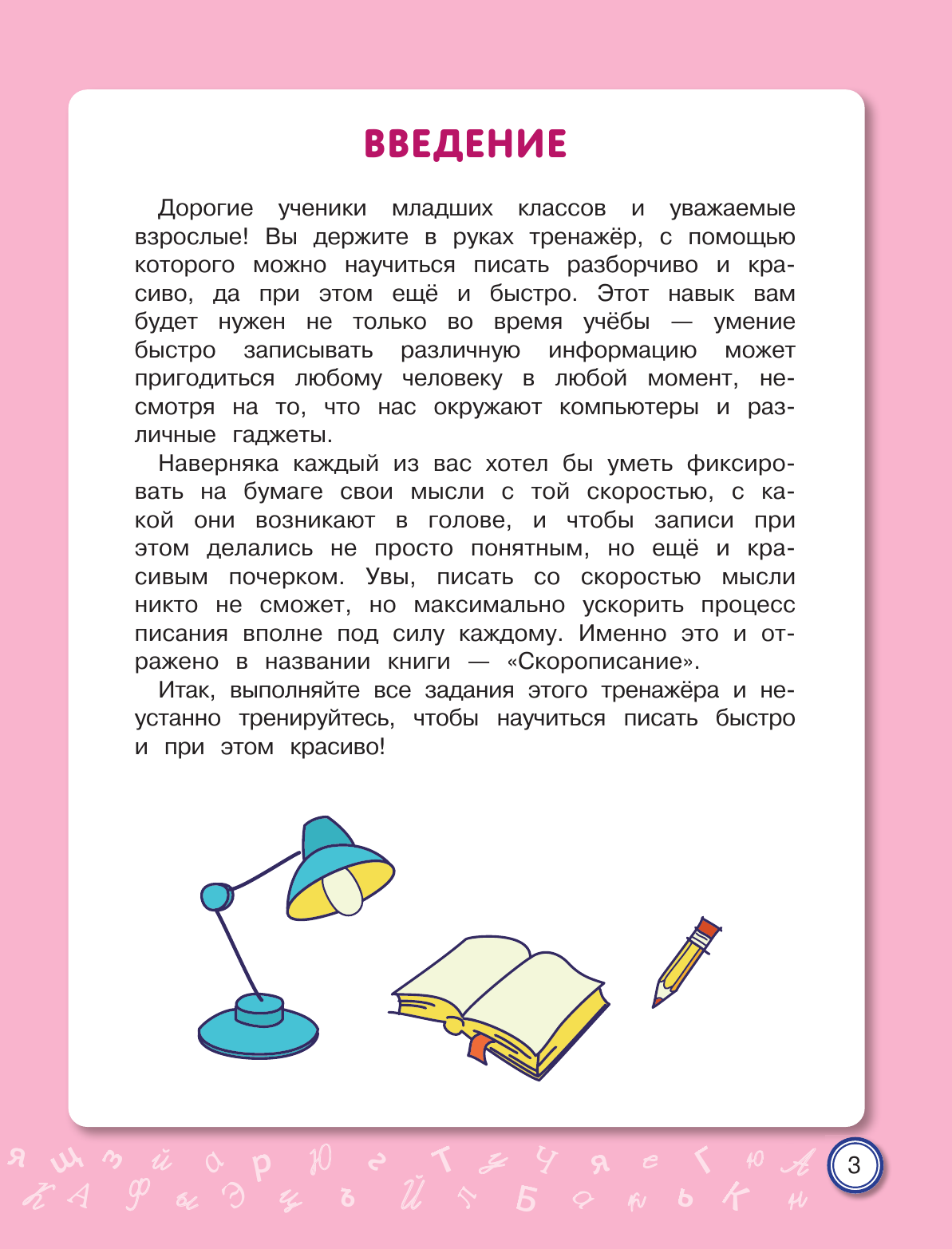 Письмо от руки — один из самых эффективных способов развития не только мелкой моторики, но и устной речи, памяти, интеллекта. Курс чистописания в начальной школе сегодня сократился до минимума. У младших школьников значительно возросла доля клавиатурного письма и работы с сенсорными устройствами. По этим причинам у них очень часто отмечается ухудшение почерка. Неправильное и медленное написание букв и их соединений приводит к проблемам не только с орфографией, но и с изложением своих мыслей, поскольку письмо — это тоже форма речи. В тренажёре представлены уникальные авторские задания по скорописанию, отвечающие требованиям времени. Научившись писать быстро и красиво, младший школьник избавится от проблем с изложением своих мыслей как на письме, так и в устной форме.