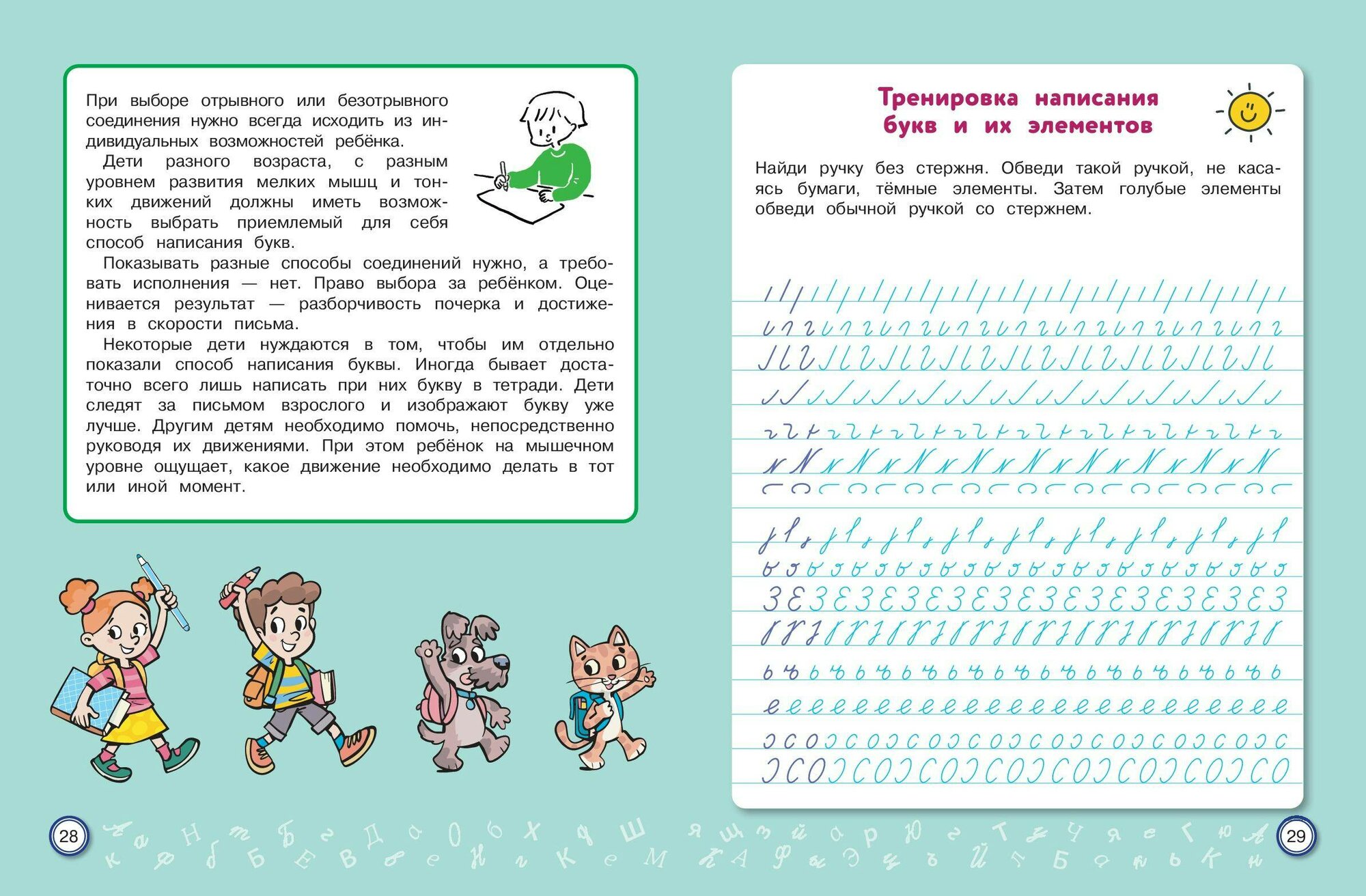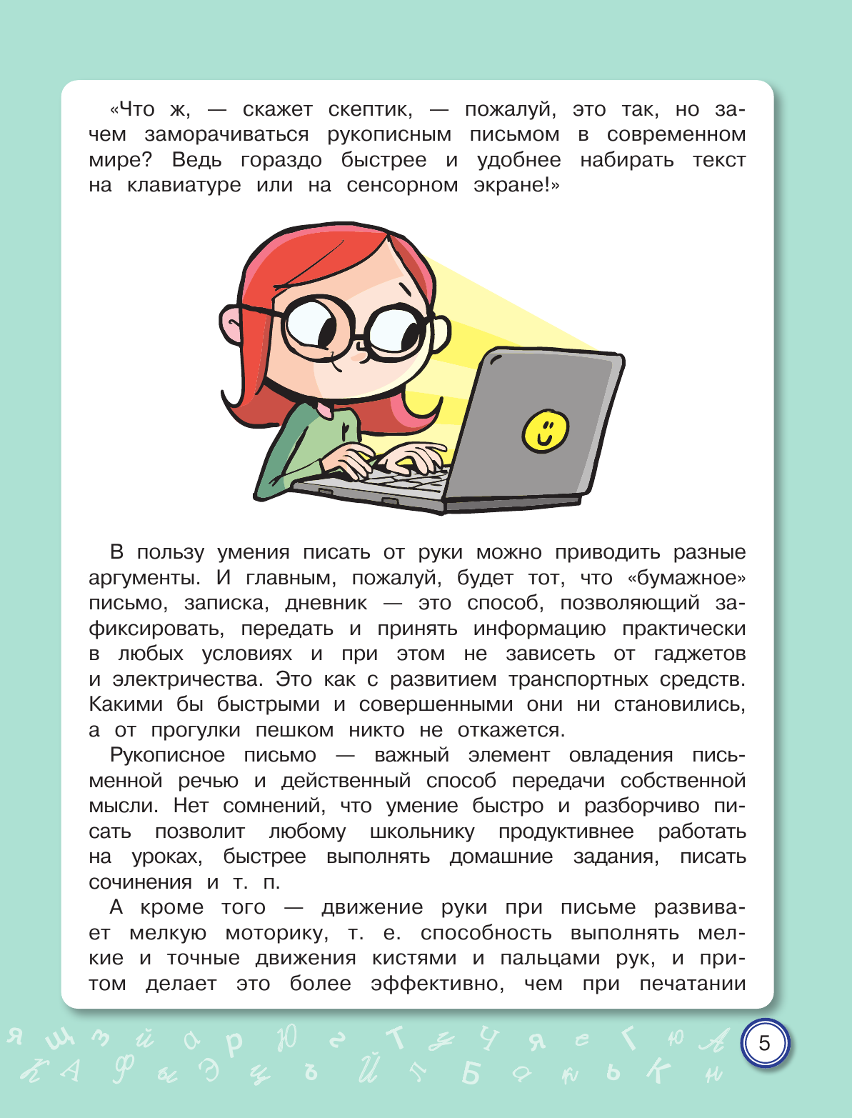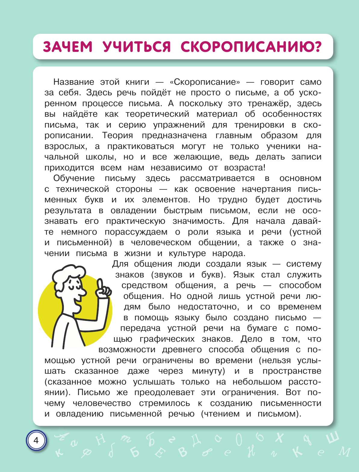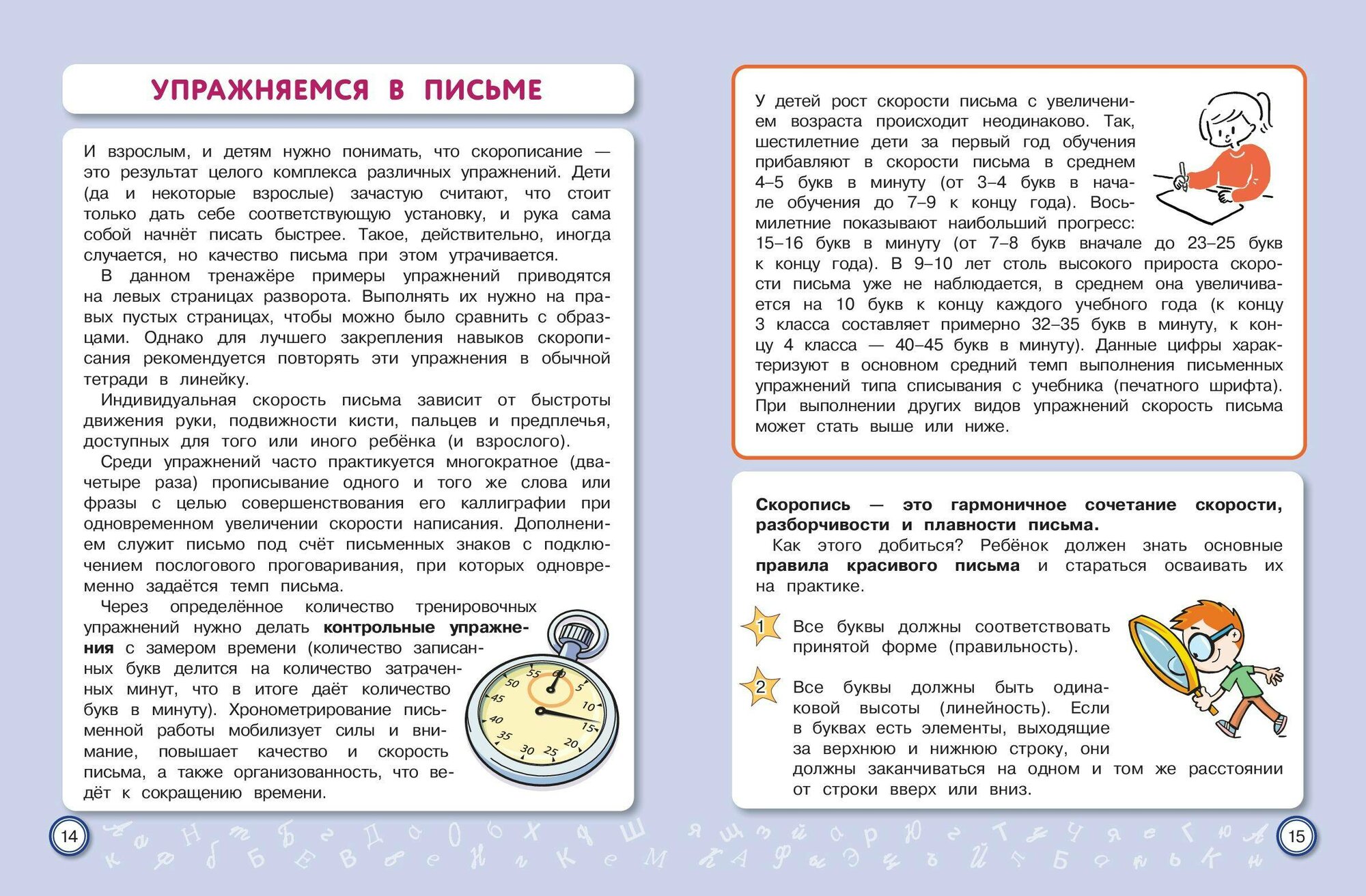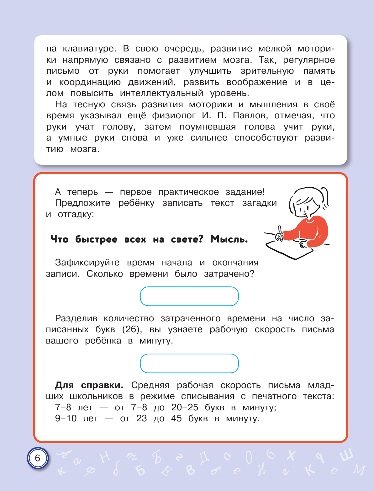 Письмо от руки — один из самых эффективных способов развития не только мелкой моторики, но и устной речи, памяти, интеллекта. Курс чистописания в начальной школе сегодня сократился до минимума. У младших школьников значительно возросла доля клавиатурного письма и работы с сенсорными устройствами. По этим причинам у них очень часто отмечается ухудшение почерка. Неправильное и медленное написание букв и их соединений приводит к проблемам не только с орфографией, но и с изложением своих мыслей, поскольку письмо — это тоже форма речи. В тренажёре представлены уникальные авторские задания по скорописанию, отвечающие требованиям времени. Научившись писать быстро и красиво, младший школьник избавится от проблем с изложением своих мыслей как на письме, так и в устной форме.