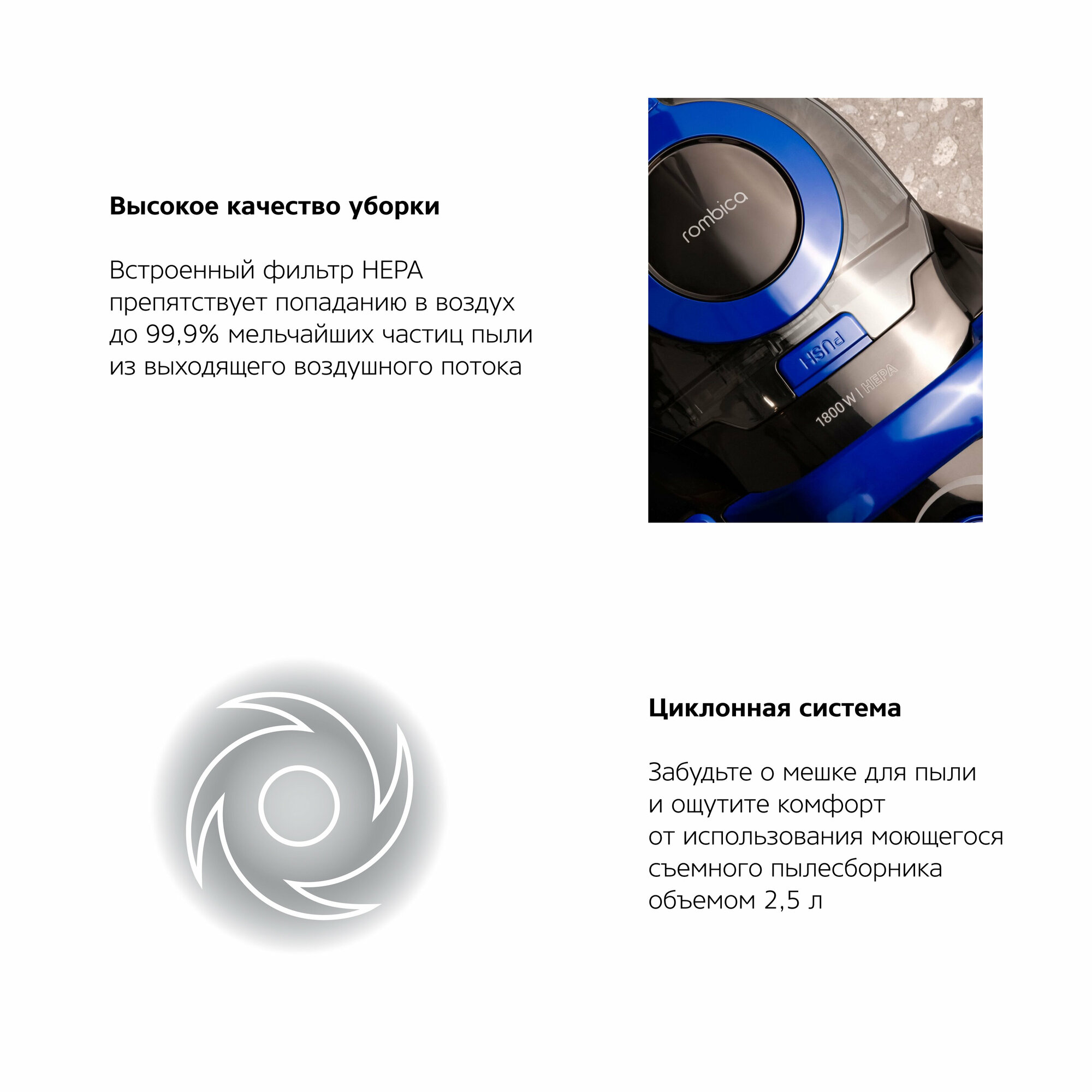 Пылесос с контейнером для пыли Rombica MyClean Sector (NBL18D02) модель в пластиковом корпусе синего цвета, работающая по принципу циклонной системы. Пылесборник устройства обладает объемом 2,5 л, что обеспечивает длительную работу без частых перерывов. Металлическая телескопическая трубка (из алюминия) позволяет добраться до труднодоступных мест и углов. Пылесос выполняет сухую уборку. В основе работы лежит двигатель стандартного типа. Мощность потребления достигает 1800 Вт. Подключение к сети осуществляется при помощи 4,5-метрового шнура для удобства сматывается автоматически. Устройство оснащено моторным фильтром. Он не позволяет пыли и частичкам грязи попасть в двигатель, что предотвращает преждевременный выход из строя. Модель поддерживает вертикальную и горизонтальную парковку. Для удобного перемещения предусмотрена ручка. Колеса с прорезиненными покрытием обеспечивают улучшенную маневренность и мобильность они не повреждают покрытие пола и не оставляют на нем следов. Для безопасности пылесос снабжен системой, которая в автоматическом режиме отключает его в случае перегрева. Размеры модели 26,5х27,5х38,5 см, вес 5,33 кг.