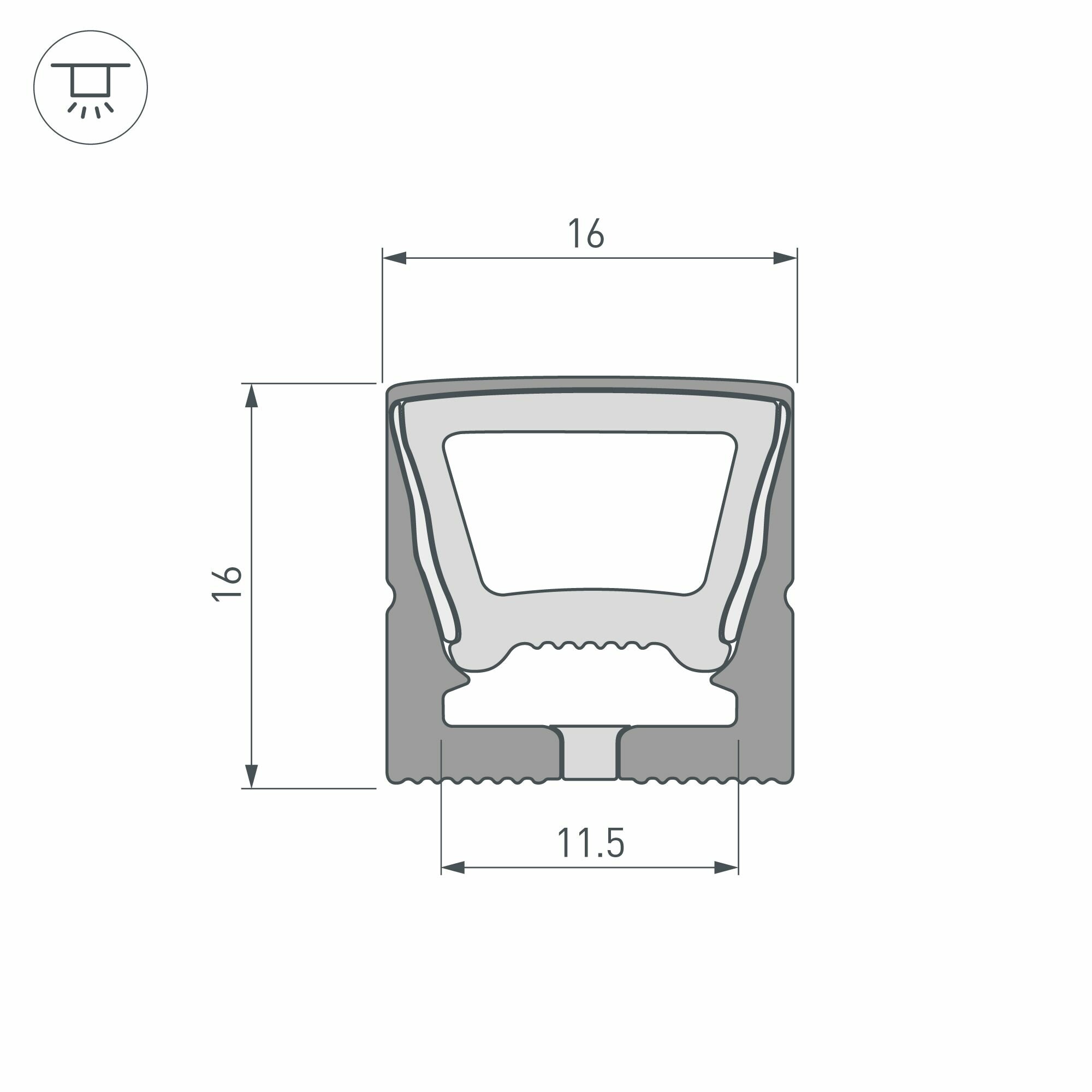 Цельнолитой силиконовый гибкий профиль, черный матовый. Габаритные размеры 5000×16×16 мм. Гнется в плоскости. Для установки во влажных помещениях необходима герметизация при помощи двухкомпонентного эпоксидного герметика. Класс пылевлагозащиты – IP65 (при соблюдении технологии герметизации). Для лент шириной 10 мм, высотой до 2,85 мм и мощностью до 10 Вт/м. Угол излучения 110°. Поставляется в катушках по 5 м. Цена за 1 м.