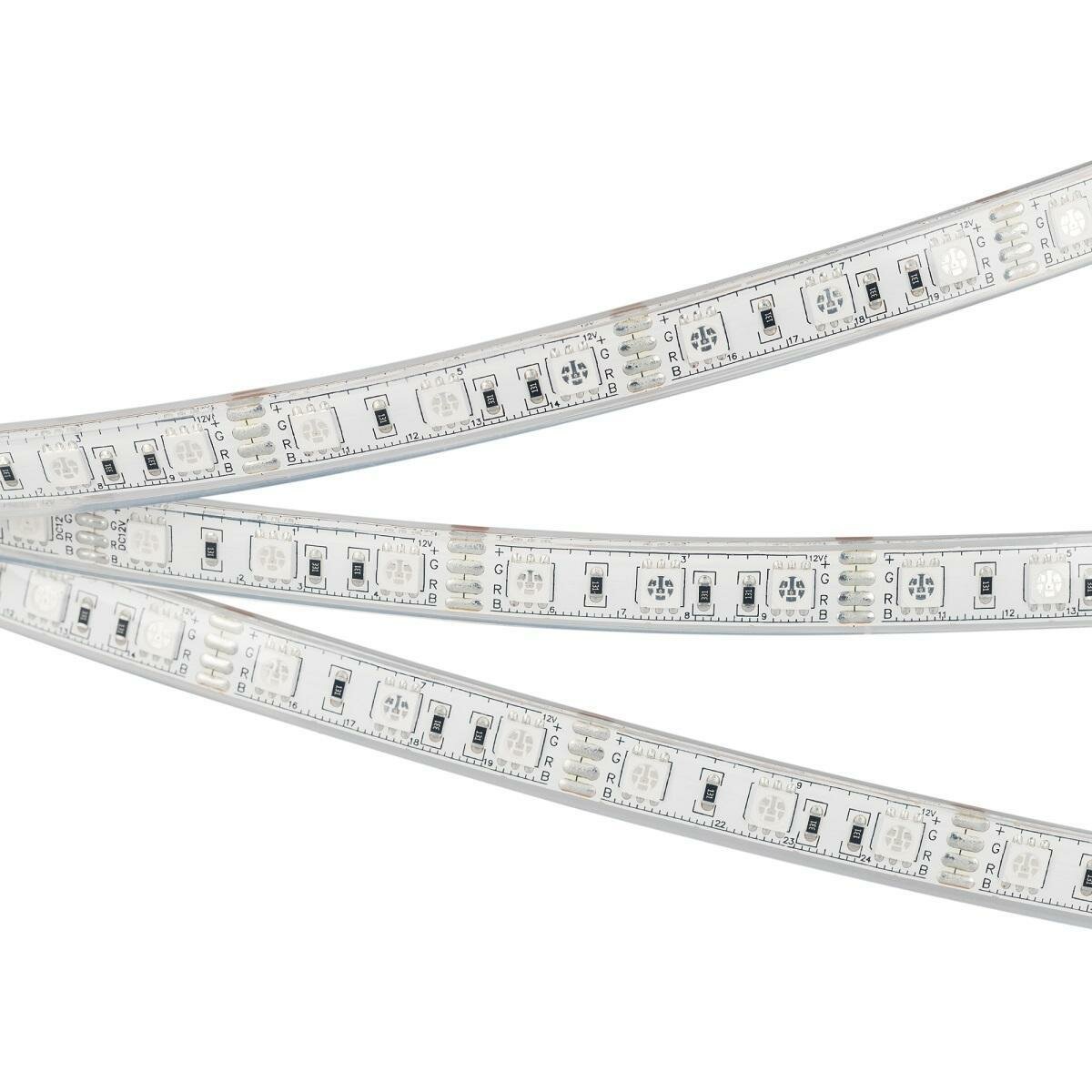 Светодиодная лента RTW-PU-B60, герметичная IP68 (PU-сплошной полиуретан), подходит для использования под водой на глубине до 2м. Светодиоды SMD 5060, 60 шт/м (300 шт на 5 м), белая плата. Цвет RGB, угол 120°. Питание 12V, мощность 14.4 Вт/м (72 Вт на 5 м). Размеры 5000x12.5x5.6 мм. Мин. отрезок 50 мм, 3 светодиода. Цена за 1 м. Лента крепится с помощью скоб, скобы идут в комплекте (5шт), 3M скотч отсутствует.