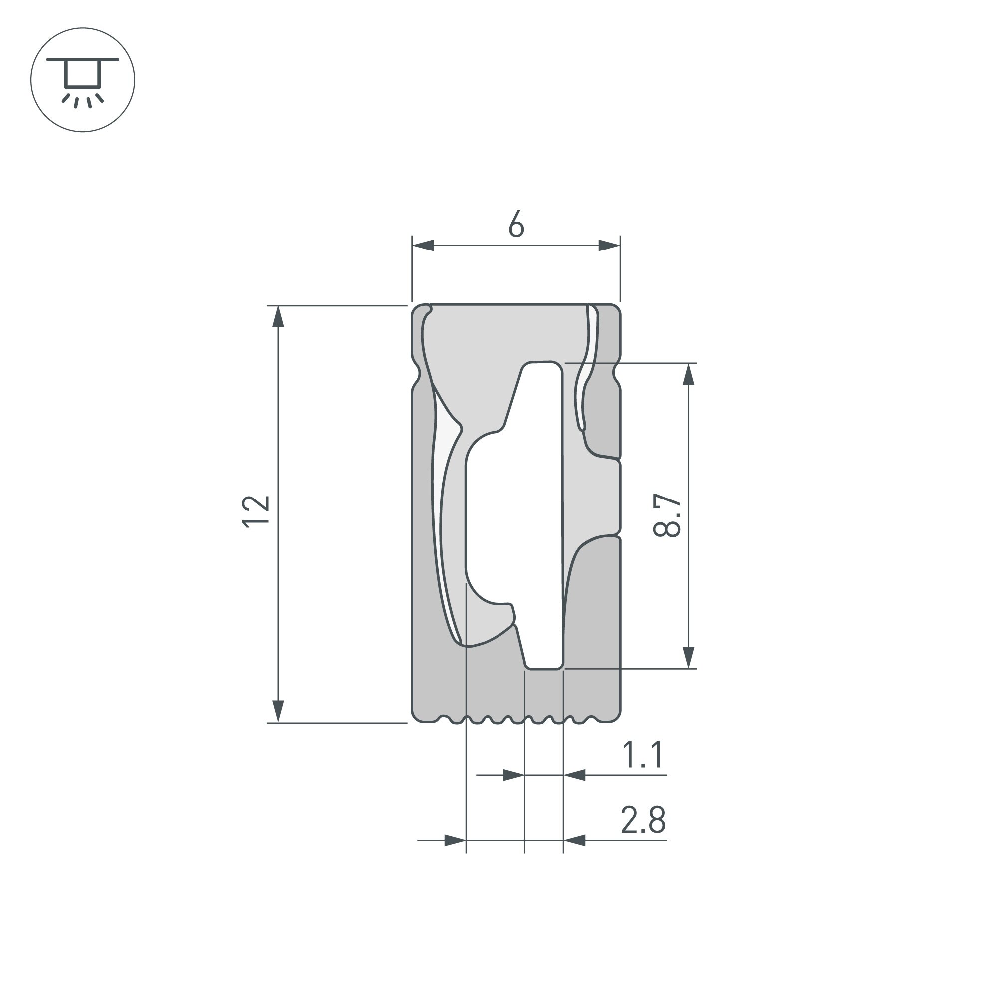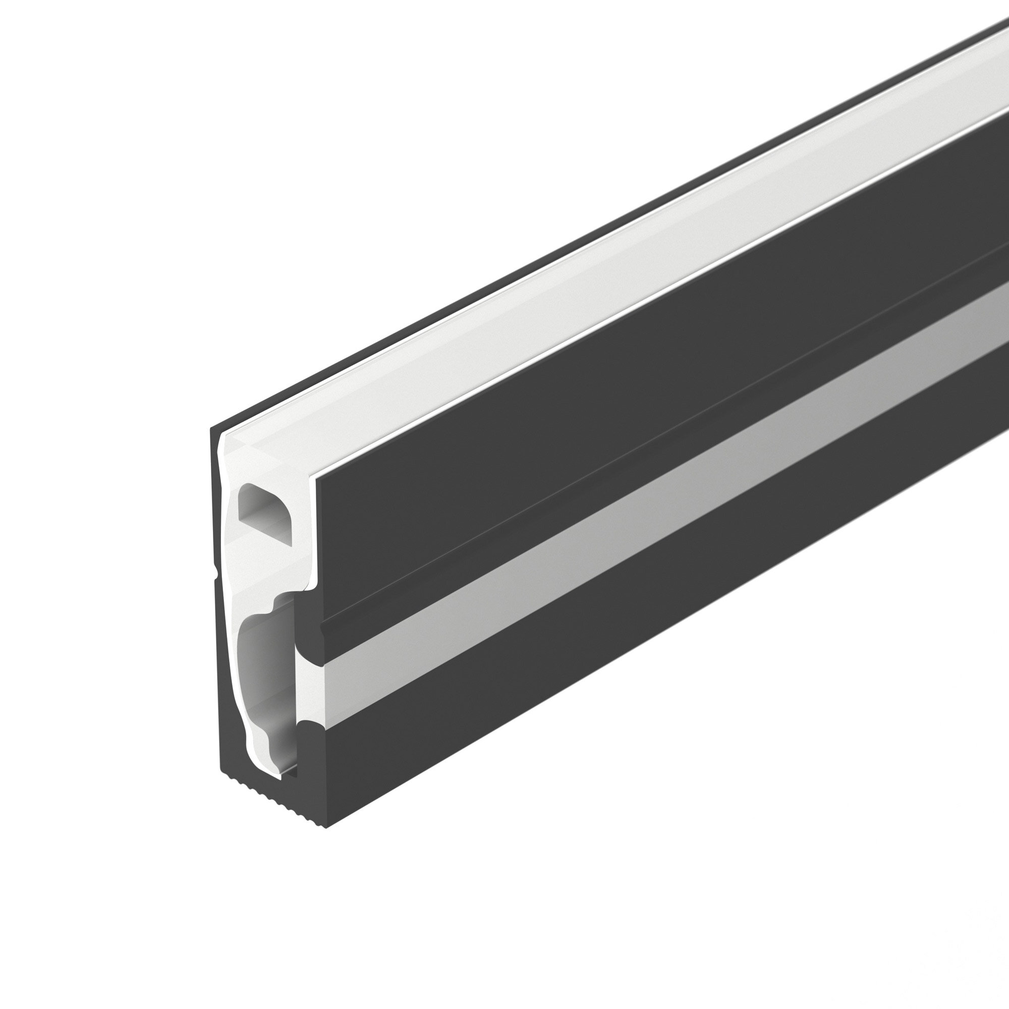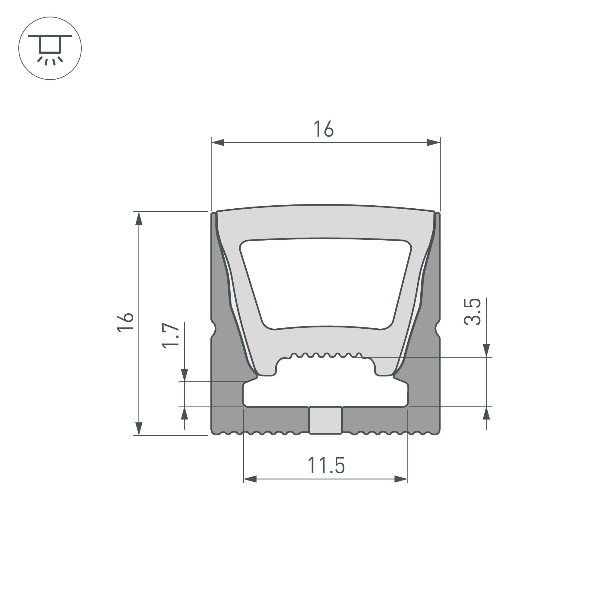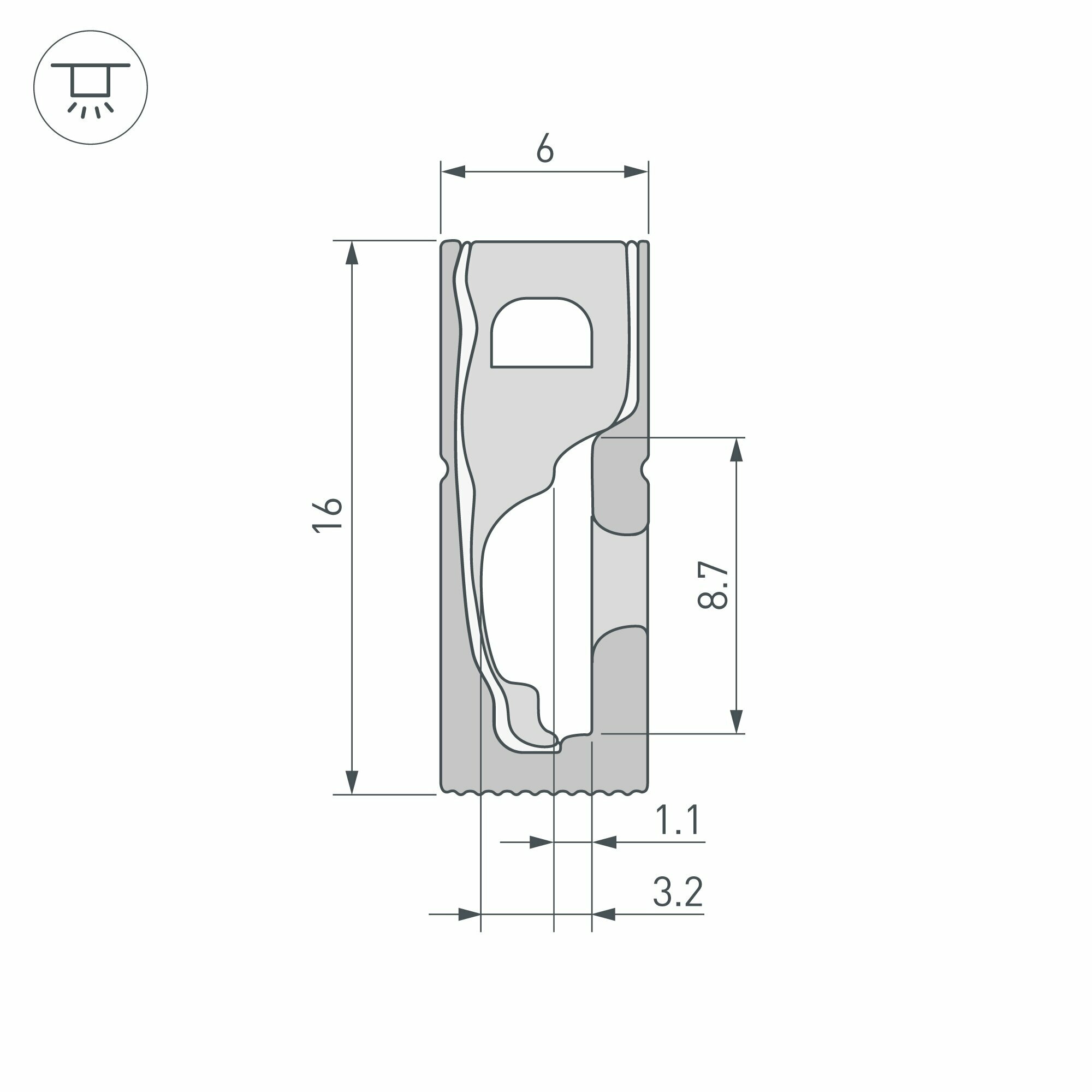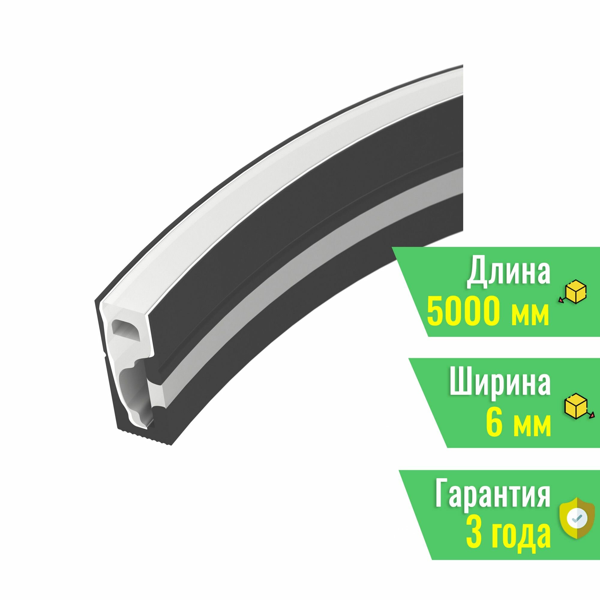 Цельнолитой силиконовый гибкий профиль, верхняя часть - белая матовая, остальные стороны - черные матовые. Габаритные размеры 5000×6×16 мм. Гнется в плоскости. Для установки во влажных помещениях необходима герметизация при помощи двухкомпонентного эпоксидного герметика. Класс пылевлагозащиты – IP65 (при соблюдении технологии герметизации). Для лент шириной от 6 до 8 мм, высотой до 2,9 мм и мощностью до 10 Вт/м. Угол излучения 150°. Поставляется в катушках по 5 м. Цена за 1 м.
