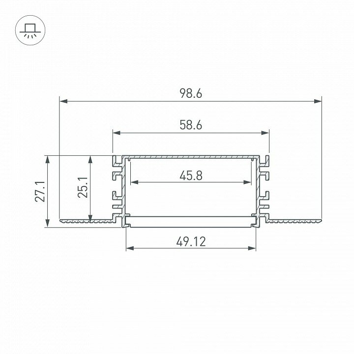 Алюминиевый встраиваемый профиль для светодиодных лент и линеек. Габаритные размеры (L×W×H): 2000х98,6х27.1 мм. Ширина площадки для ленты 45,8 мм. Экраны, заглушки и другие аксессуары приобретаются отдельно. Цена за 1 метр.