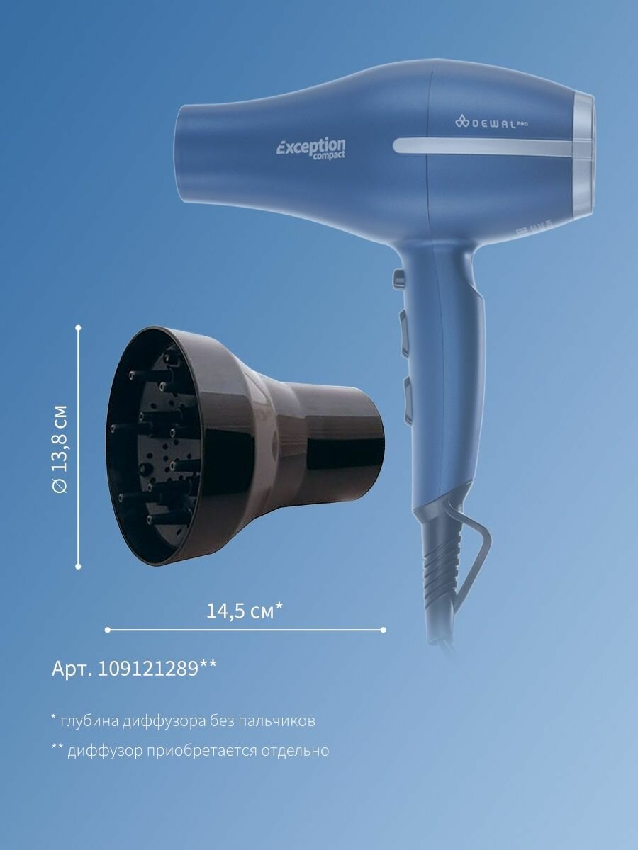 Профессиональный фен DEWAL EXCEPTION COMPACT обладает маневренностью и большой мощностью и поэтому идеально подходит для работы в салоне.