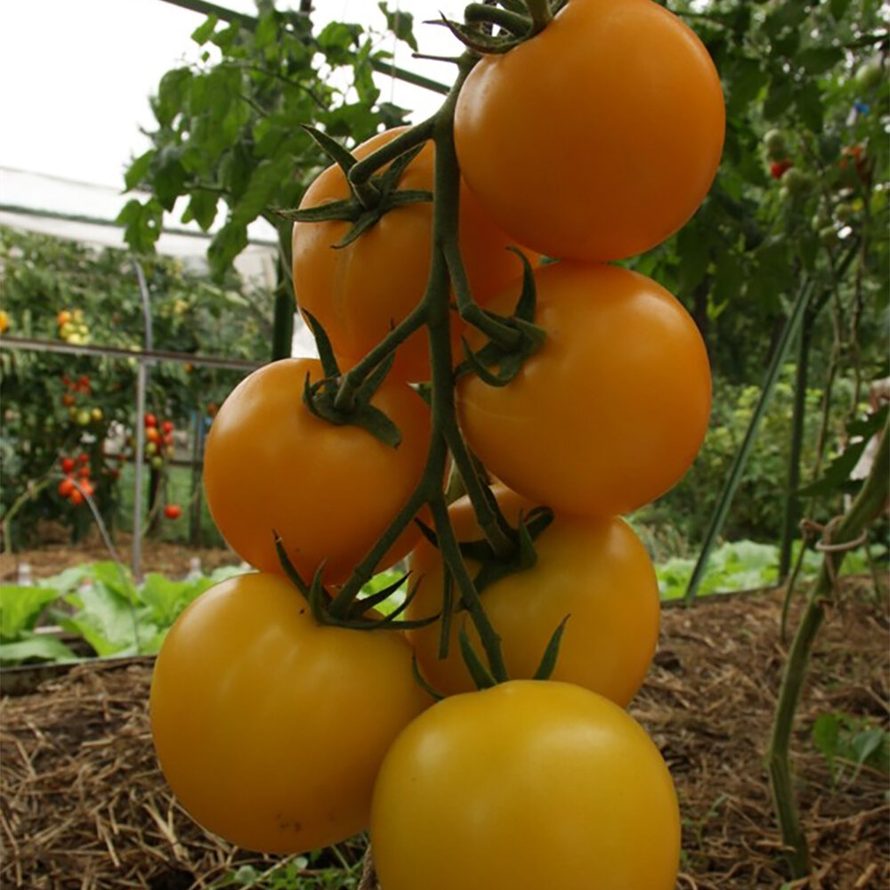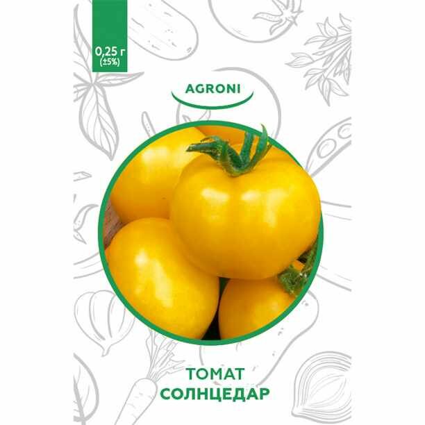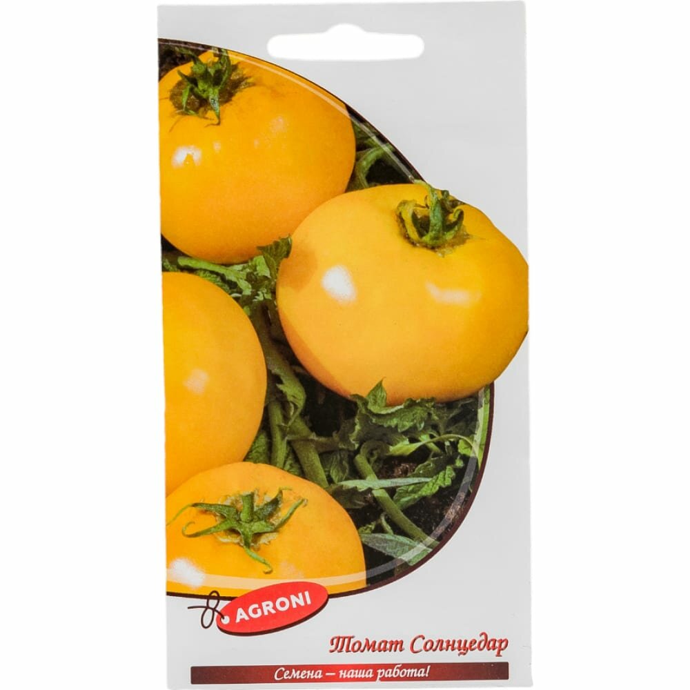 **Семена овощей Agroni томат Солнцедар** — среднеспелый сорт. Плоды крупные, с нежной ароматной мякотью. Максимальный вес томата — 0,2 кг. Подходит для употребления в свежем виде, приготовления пасты и сока.