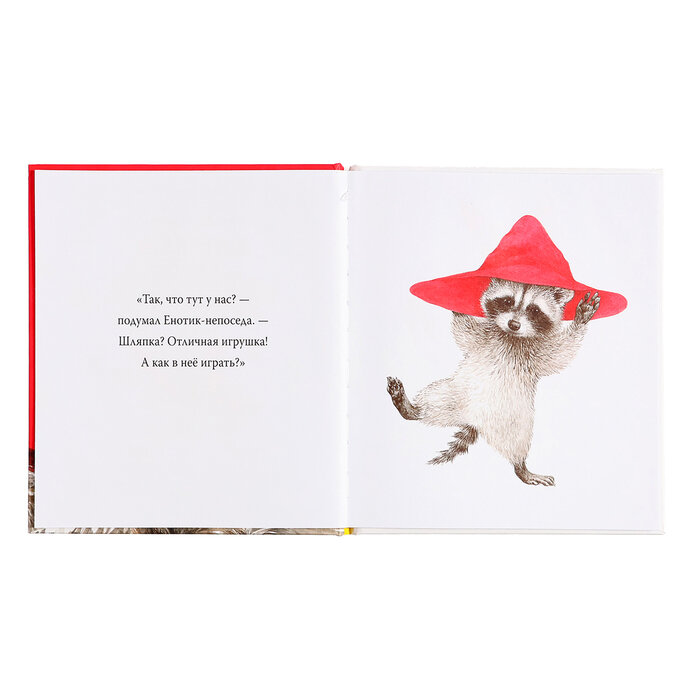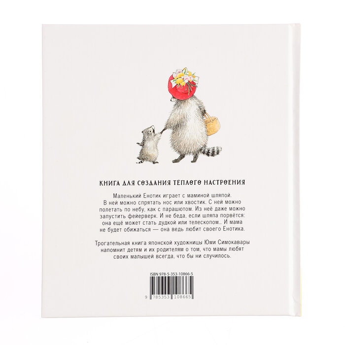 Маленький Енотик играет со шляпой. В ней можно спрятать нос или хвостик. С ней можно полетать по небу, как с парашютом. Из нее даже можно запустить фейерверк. И не беда, если шляпа порвется: она еще может стать и дудкой, и телескопом, и кондитерским шприцем… Правда, шляпа-то мамина. Но мама не будет обижаться — она ведь любит своего Енотика. Трогательная книга японской художницы Юми Симокавары напомнит детям и их родителям о том, что мамы любят своих малышей всегда, что бы ни случилось.