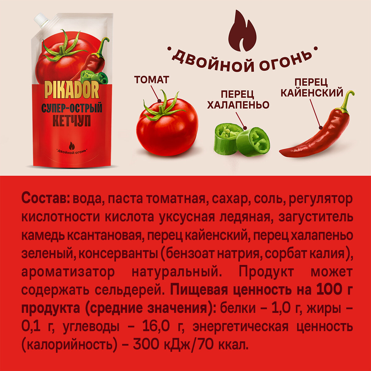 Супер-острый томатный кетчуп Pikador создан специально для тех, кто хочет добавить в жизнь острые ощущения. Это неожиданно пикантный кетчуп, который говорит сам за себя. Двойной огонь кайенского перца и зеленого перца халапеньо придаст яркости и жгучей остроты любому блюду. Pikador новое прочтение ваших любимых вкусов, а супер-острый его шокирующий акцент.