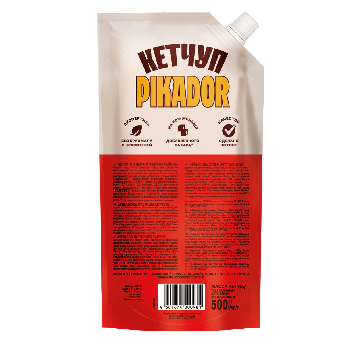 Супер острый томатный кетчуп Pikador представлен в удобных для хранения и транспортировки пакетах дой-пак весом 500 г. Дой-пак позволяет сохранить вкус и свежесть продукта в течение всего срока использования. Такая упаковка будет очень кстати для большой компании или многолюдных дачных вечеринок с мясом на мангале.
