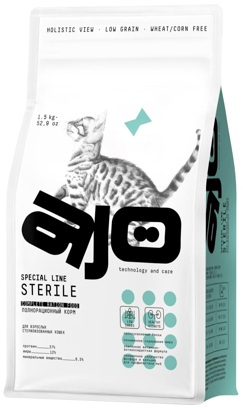 AJO Sterile полнорационный корм для стерилизованных кошек (Курица и утка 15 кг.) Cat Sterile для активных стерилизованных кошек с высоким содержанием белка 1,5 кг