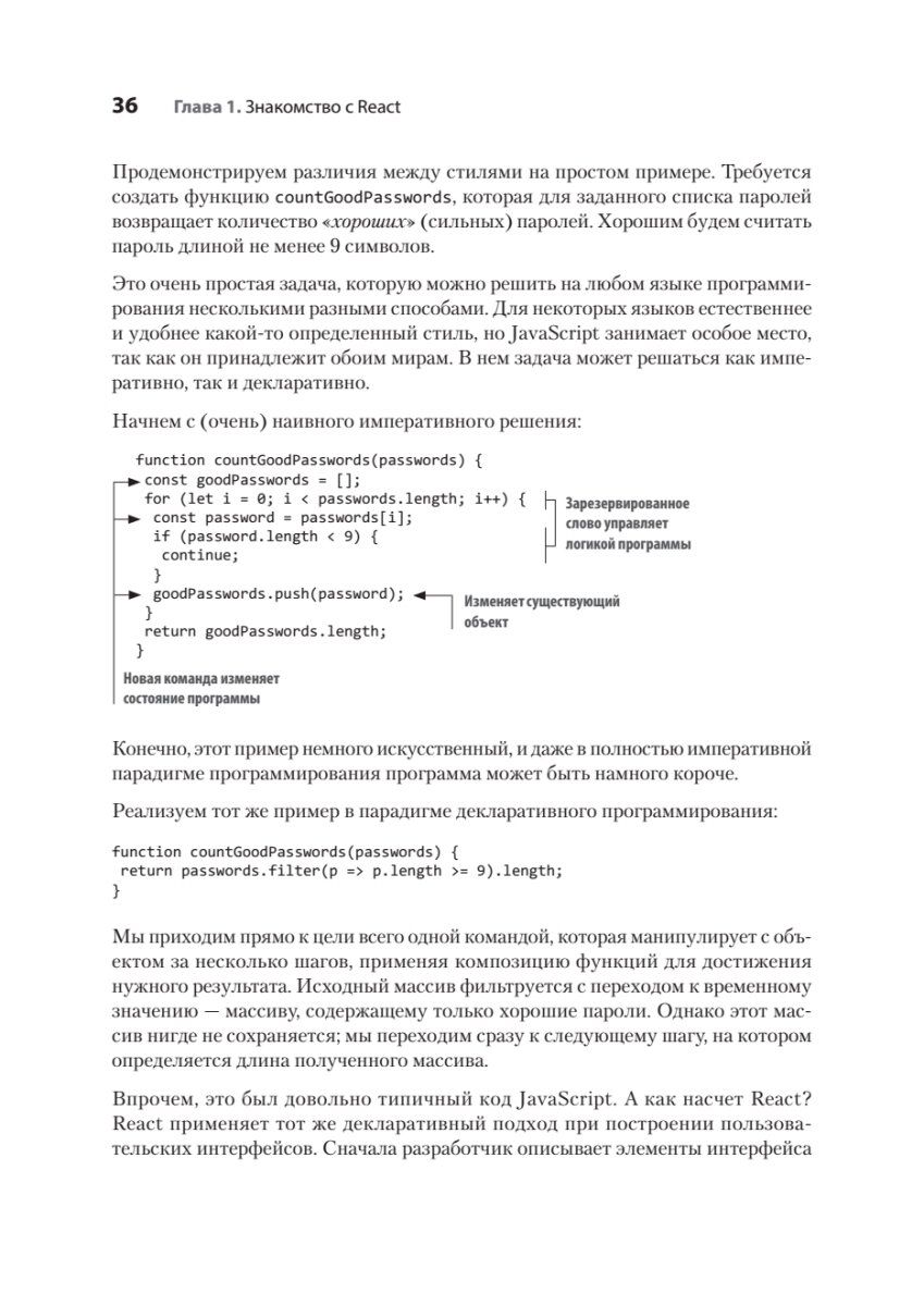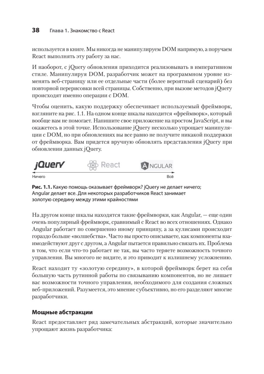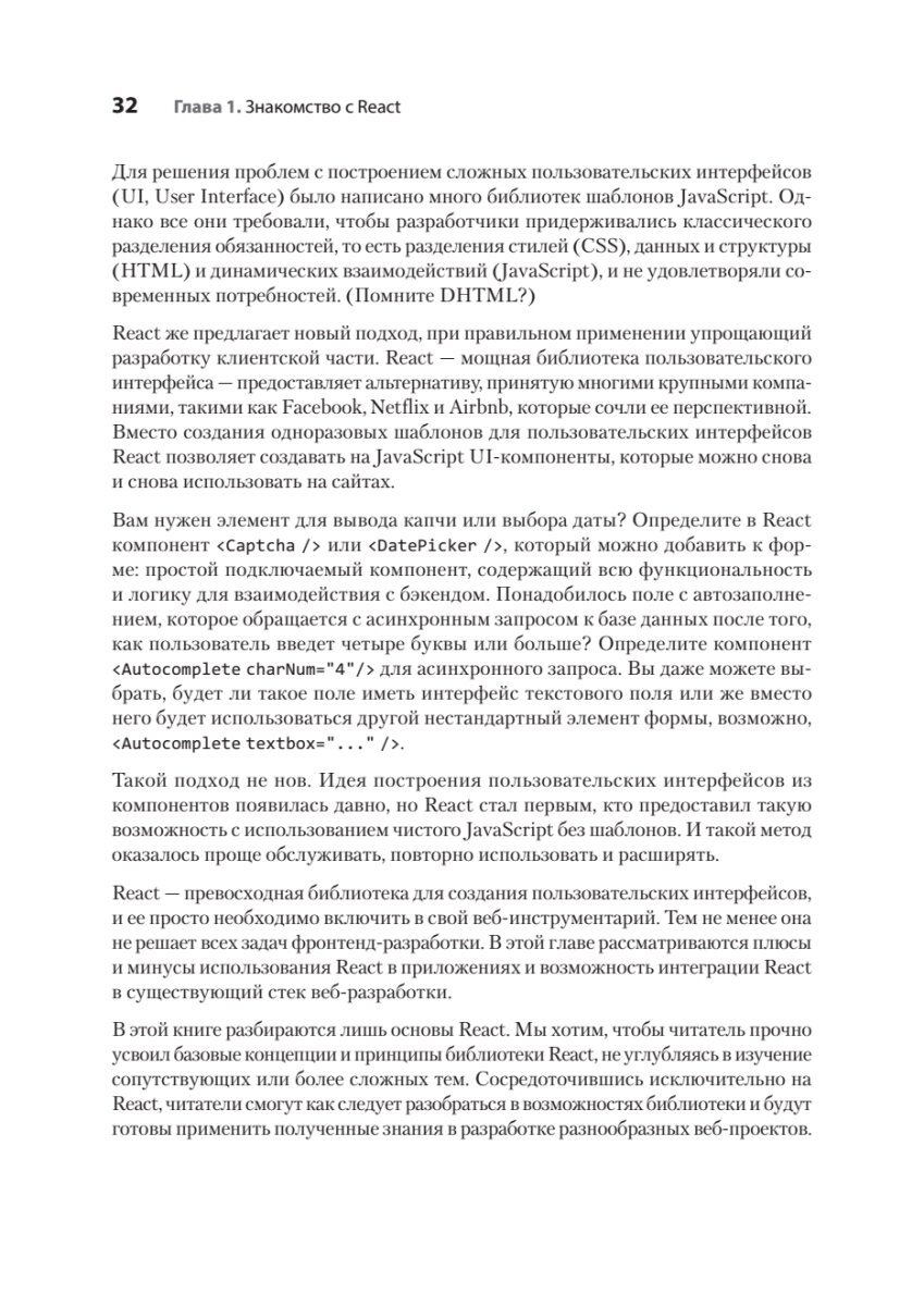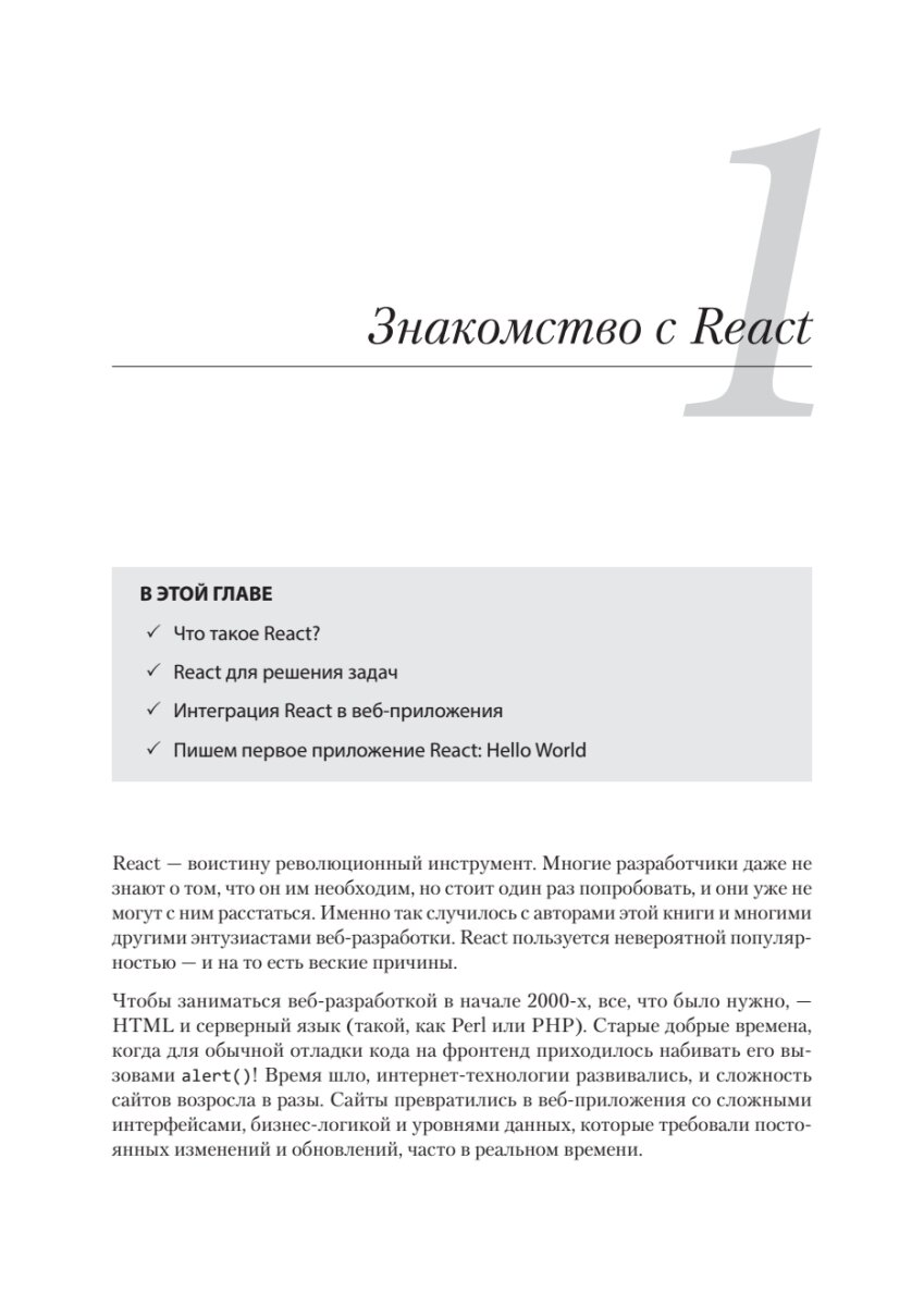 React предельно упрощает создание привлекательных и надежных интерфейсов для веб-приложений. Эта великолепная библиотека JavaScript имеет модульную архитектуру, что позволяет легко создавать, объединять и тестировать компоненты. React идеально подходит для небольших прототипов, корпоративных сайтов и других подобных решений.«React быстро. 2-е издание» предлагает уникальный подход к освоению фреймворка React. Более 80 компактных примеров проведут читателя от изучения основ работы к созданию довольно сложных приложений. В книге подробно описаны многие функциональные компоненты, хуки React и средства доступности веб-приложений, а также представлены интересные проекты для отработки новых навыков.Книга предназначена для разработчиков, имеющих опыт создания веб-приложений на базе JavaScript.