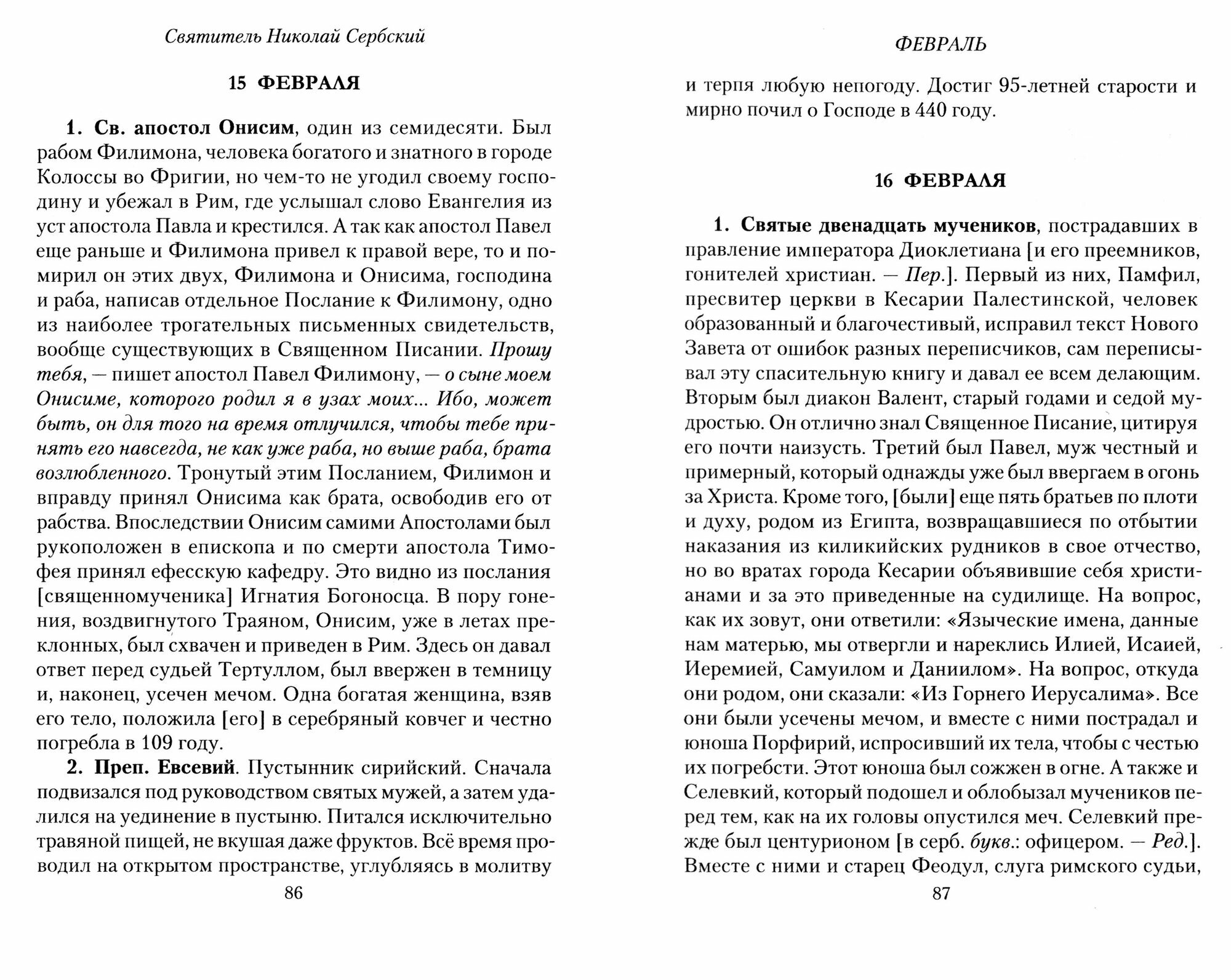 "Я однажды пришла к батюшке, что-то рассказываю, а он так качает головой. Деточка, деточка, говорит, читай жития святых!. Почему он мне так сказал?." Потому что жития святых - это живая история Церкви. Это не рассуждения, не назидания, а пример реальных поступков реальных людей, стоявших перед выбором греха или добродетели, или теплохладности. Жития святых - это школа христианской жизни. Святитель Николай Сербский (Велимирович)(1880-1956), величайший серб XX столетия, епископ Охридский и Жичский Сербской Православной Церкви, богослов, переводчик, духовный писатель, видный сербский церковный деятель, благотворитель. В начале XX века святитель Николай обучался в России, был фронтовым священником во время Первой мировой войны. Во время Второй мировой войны он неоднократно арестовывался немецкими оккупационными властями, в декабре 1944 г. был помещен в концлагерь Дахау. После войны не вернулся в социалистическую Югославию, эмигрировал в США. Земной путь окончил в русском монастыре Святителя Тихона в Пенсильвании, США. В 2003 г. прославлен в лике святых Архиерейским собором Сербской Православной Церкви. Свт. Николай наш старший современник, и книги свои он писал для современного ему человека. Древние жития святых, им собранные и переработанные, понятны современному читателю, как глубоко укоренному в православной традиции, так делающему первые шаги в Церкви.
