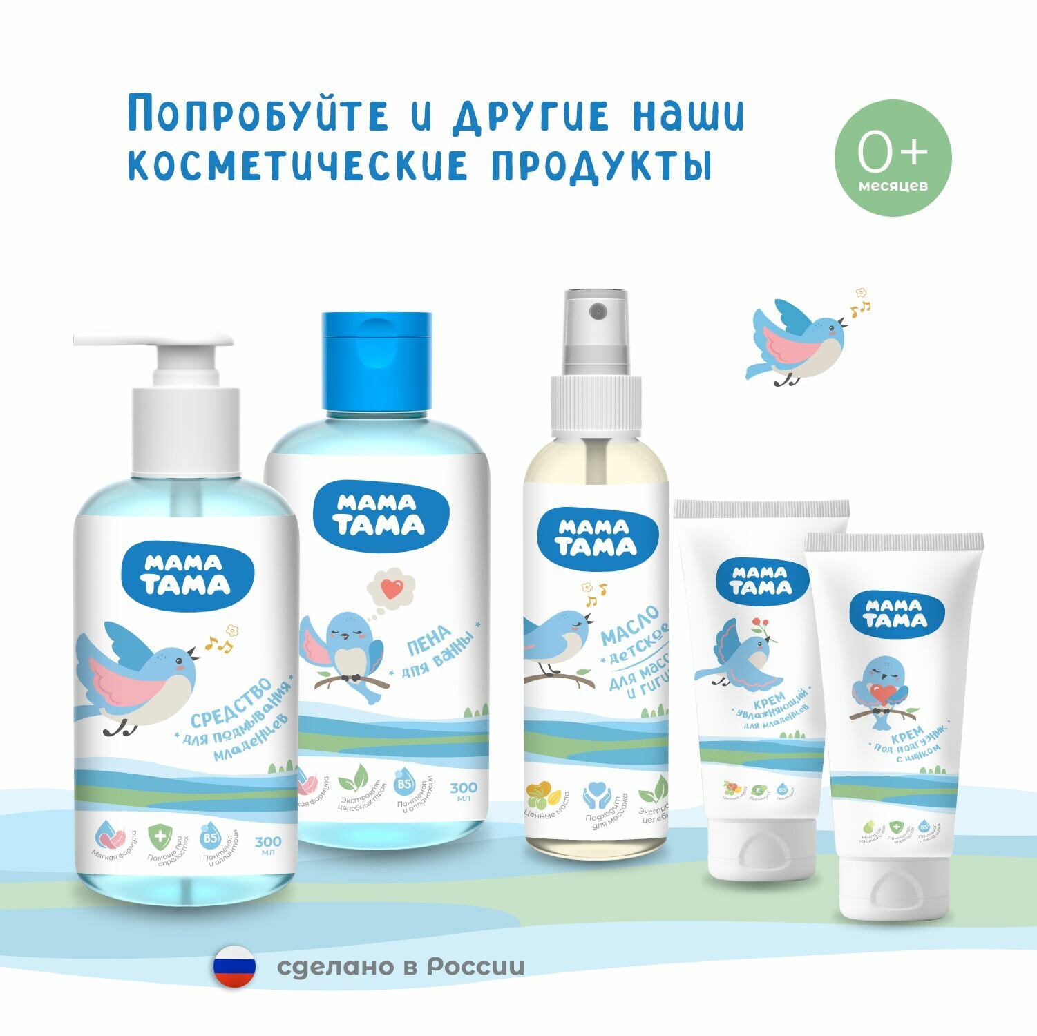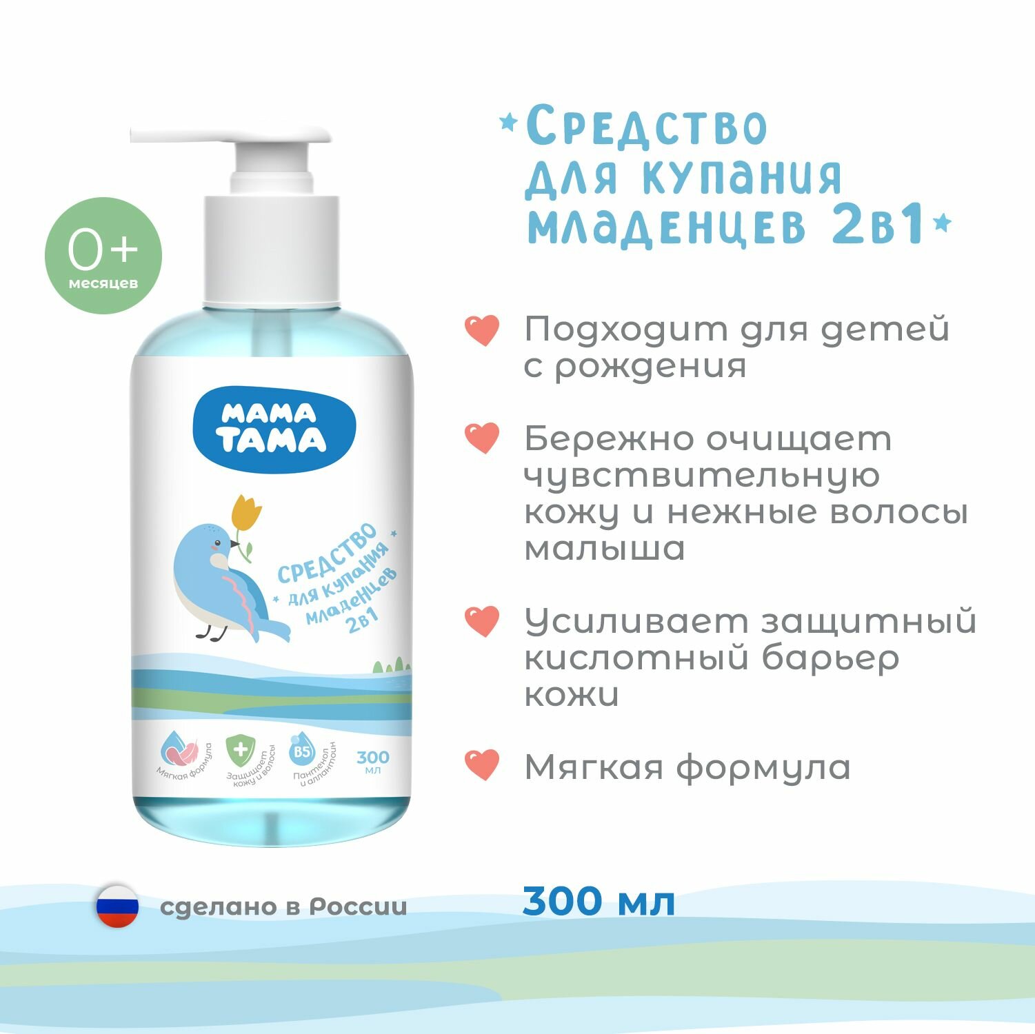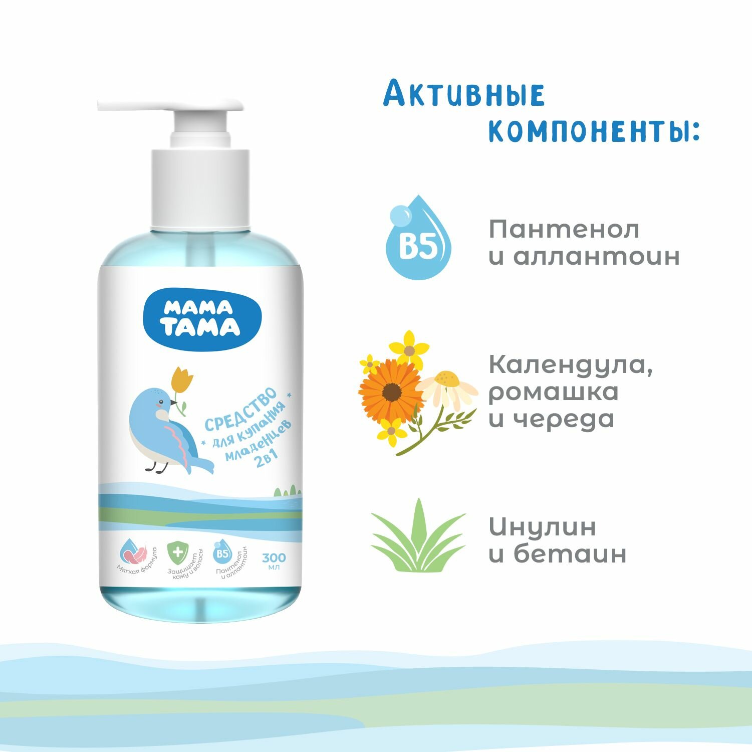 Средство для купания и шампунь торговой марки МАМА ТАМА. Бережно очищает чувствительную кожу и нежные волосы малыша. Содержит Пантенол и аллантоин, помогающие предотвратить сухость кожи и волос. Экстракты календулы, ромашки и череды усиливают физиологический кислотный барьер кожи младенца и защищают от воспаления. Подходит для использования с первых дней жизни.