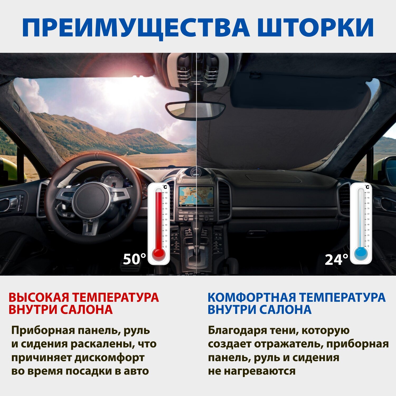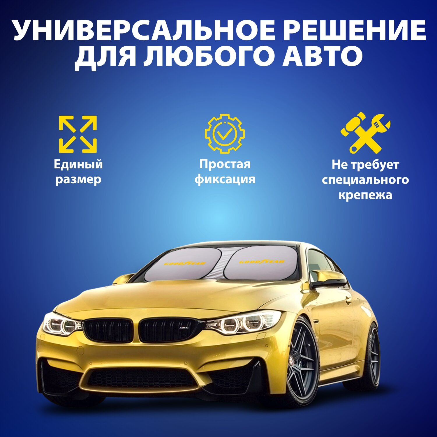 Шторка Goodyear имеет прочное серебристое покрытие, которое отражает ультрафиолет и инфракрасные лучи. Светоотражающий экран полностью закрывает лобовое стекло и блокирует проникновение солнечных лучей внутрь салона. Универсальный размер 153 х 75 см. подходит для большинства легковых автомобилей.