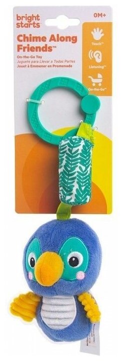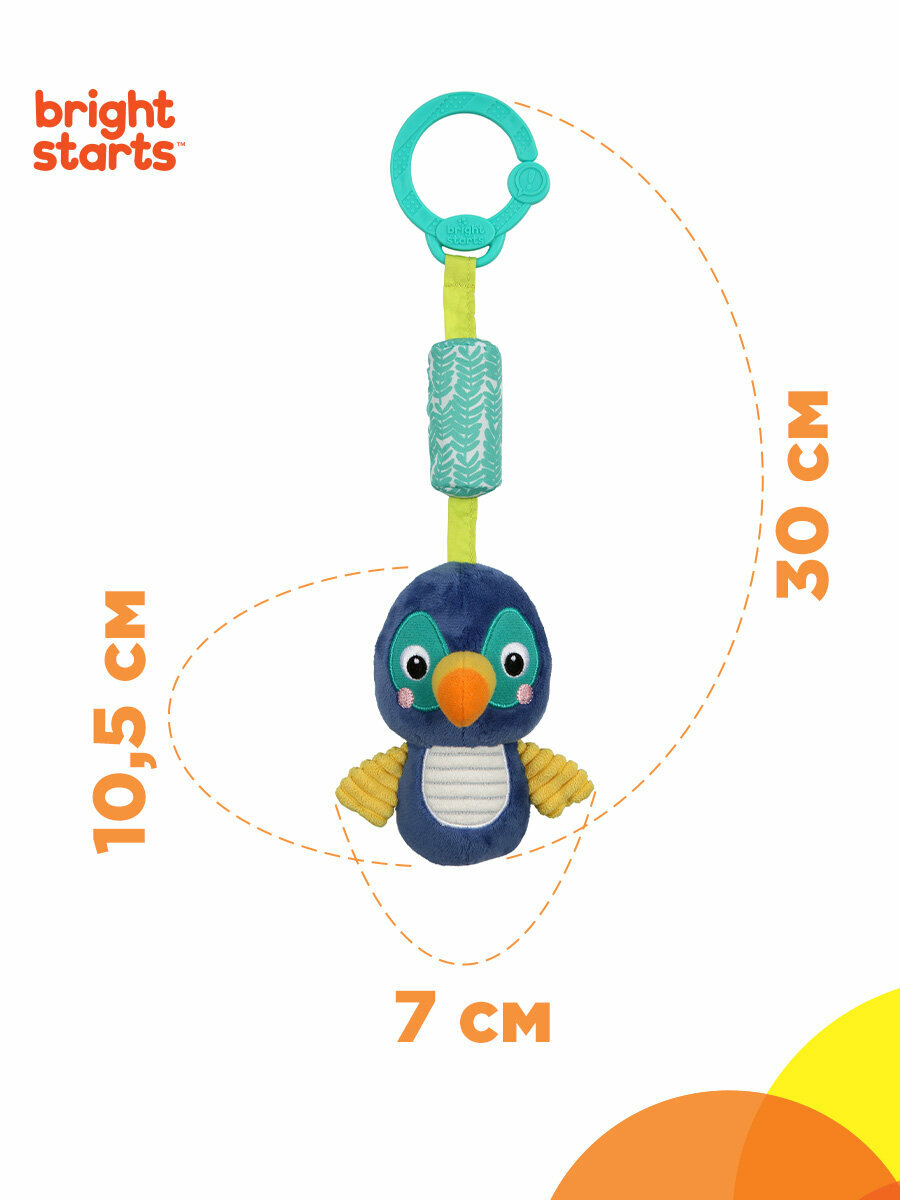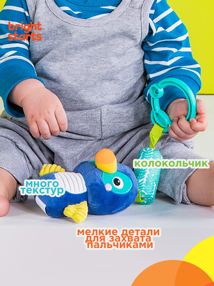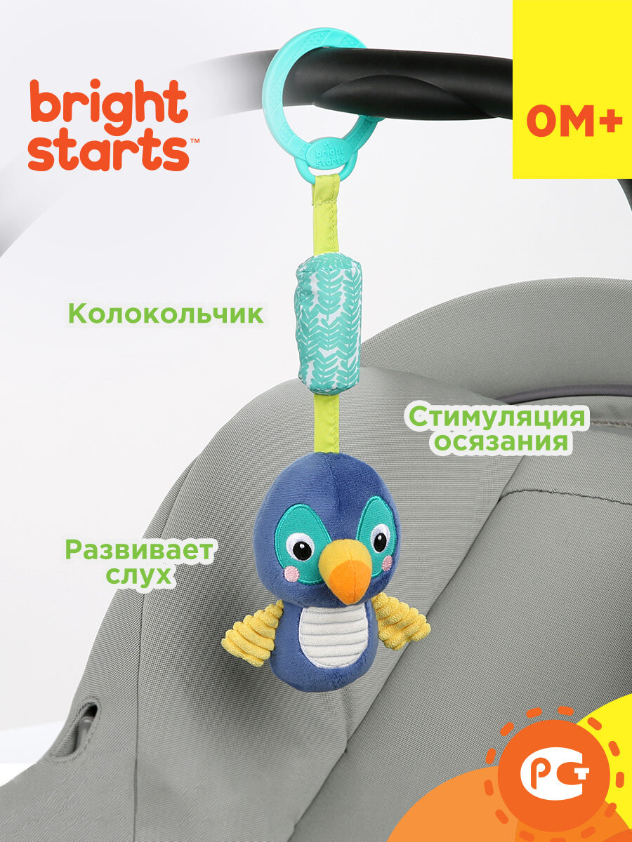 Развивающая игрушка колокольчик для новорожденных малышей с 0 месяцев - подвес Тукан Bright Starts. Подвес представляет собой мягкий подвес с механическим колокольчиком, реагирующим нежным позвякиванием. Ребёнку достаточно дотянуться до игрушки и раздастся звук колокольчика, стимулирующая малыша тянуться к игрушке и больше двигаться. Вышитые элементы и множество различных тканевых текстур будут стимулировать тактильные ощущения. Легко путешествуйте с этой мягкой синей птичкой, прикрепив ее к коляске или переноске при помощи универсального крепителя.