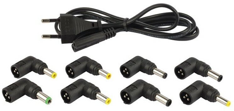 Устройство представляет собой универсальный импульсный адаптер питания для ноутбуков с максимальной выходной мощностью 65Вт. Выходное напряжение постоянного тока на выходе адаптера питания может принимать одно из следующих значений: 15В, 16В, 18,5В, 19В, 19,5В. Выбор выходного напряжения осуществляется с помощью подсоединения одного из 8-и выходных разъемов, входящих в комплект поставки. Штекеры разъемов также отличаются размерами, благодаря этому достигается совместимость с большим количеством современных моделей мобильных компьютеров.