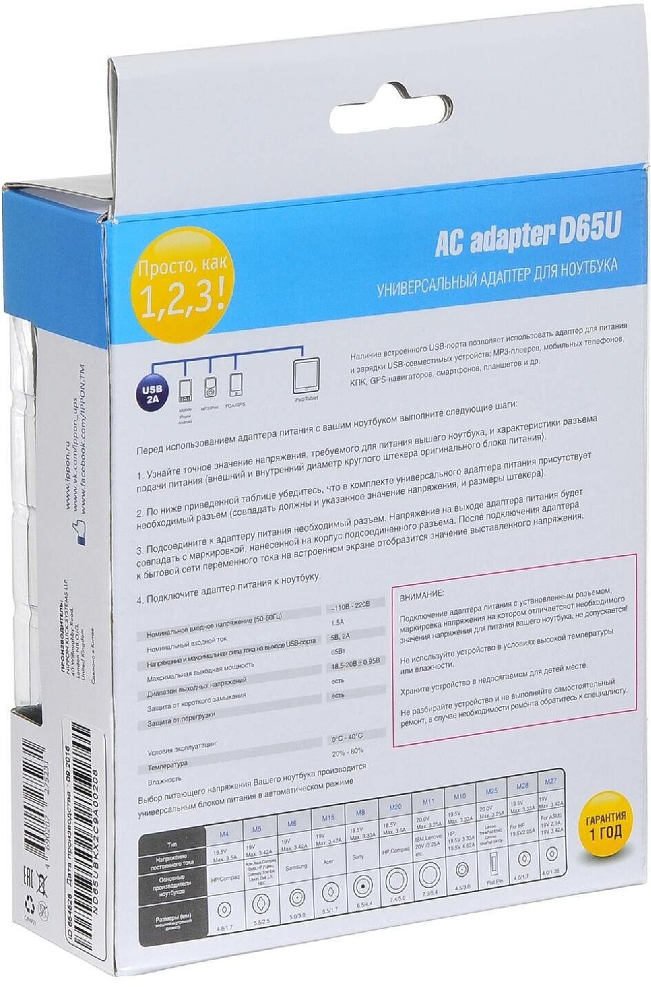 | Комплектация | Блок питания для ноутбука Ippon D65U, шнур питания для подключения к сети переменного тока, комплект выходных разъемов M1-M8, руководство пользователя |