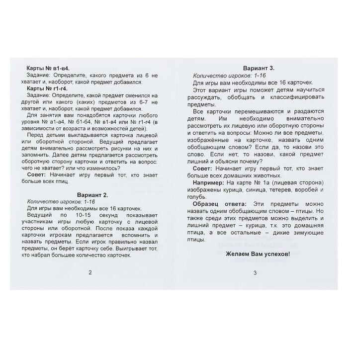 | Описание | Предлагаем вам игру для индивидуальных и групповых занятий. Игра поможет достичь успехов в развитии ребенка:активизировать внимание, память, мышление, зрительное восприятие, совершенствовать коммуникативные навыки детей.,,Комплектность:,Карты – 8,Правила – 1 |