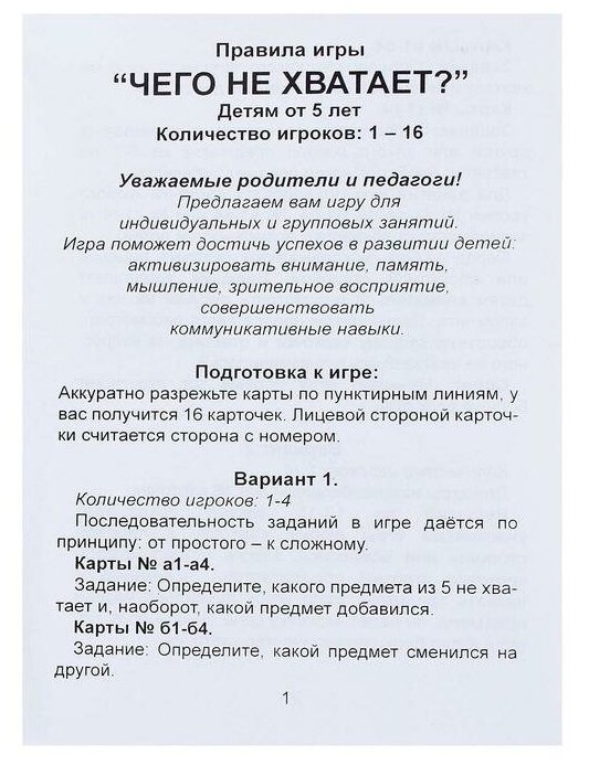 Карточки настольной игры содержат изображения разных предметов, которые знакомы ребёнку. После изучения иллюстраций, ребёнок анализирует их и приступает к выполнению заданий. Задачки очень интересные, поэтому дети не устают. Настольная игра способствует расширению словарного запаса, тренирует память, скорость мышления, внимание и наблюдательность. Дети учатся мыслить логически, быть усидчивыми. Всё это положительно сказывается на их развитии и подготовке к школьному образованию.