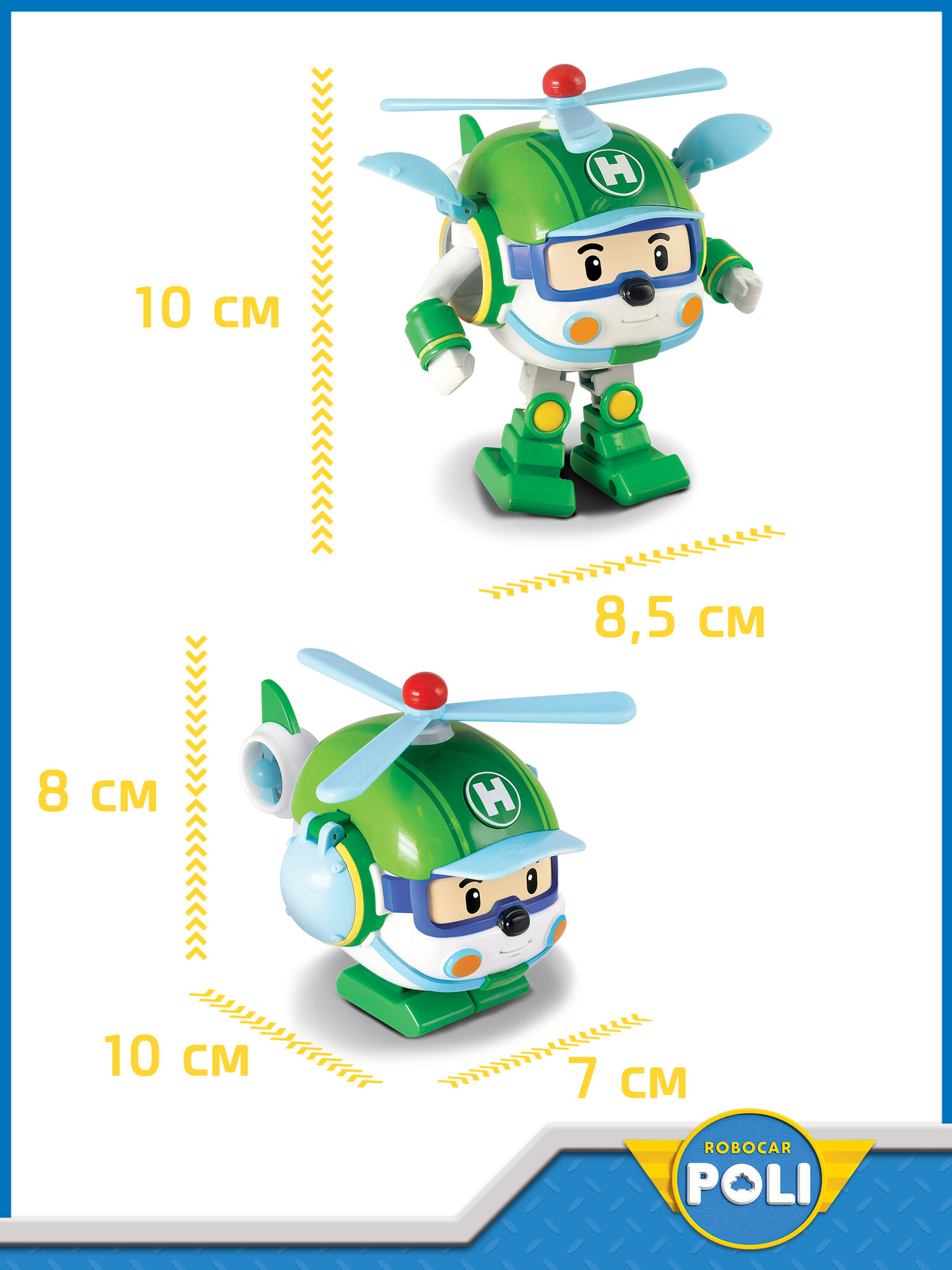 Игрушка поставляется в оригинальной корейской упаковке! Трансформер-вертолёт Хели 10 см. - один из главных героев команды спасателей Робокар Поли. Как и герой мультика трансформер Хели 10 см. может трансформироваться из робота в спасательный вертолёт. Трансформация игрушки происходит за несколько простых движений, из робота превращается в вертолёт с глазками на лобовом стекле и крутящимся пропеллером. Несложная трансформация станет прекрасной тренировкой для мелкой моторики рук и фантазии. Корпус игрушки выполнен из пластика высокого качества. Вертолёт окрашен стойкими красителями, которые абсолютно безопасны для детей и долгое время сохраняют яркость. Миссия отряда спасателей Poli Robocar — делать мир лучше. Главный герой — робокар Поли (полицейский автомобиль), всегда быстро находит решение любой проблемы, и поэтому именно он возглавляет спасательную команду. В эту команду также входят роботрак Рой (пожарная машина), робовэн Эмбер (машина скорой медицинской помощи) и робокоптер Хэли (спасательный вертолёт).