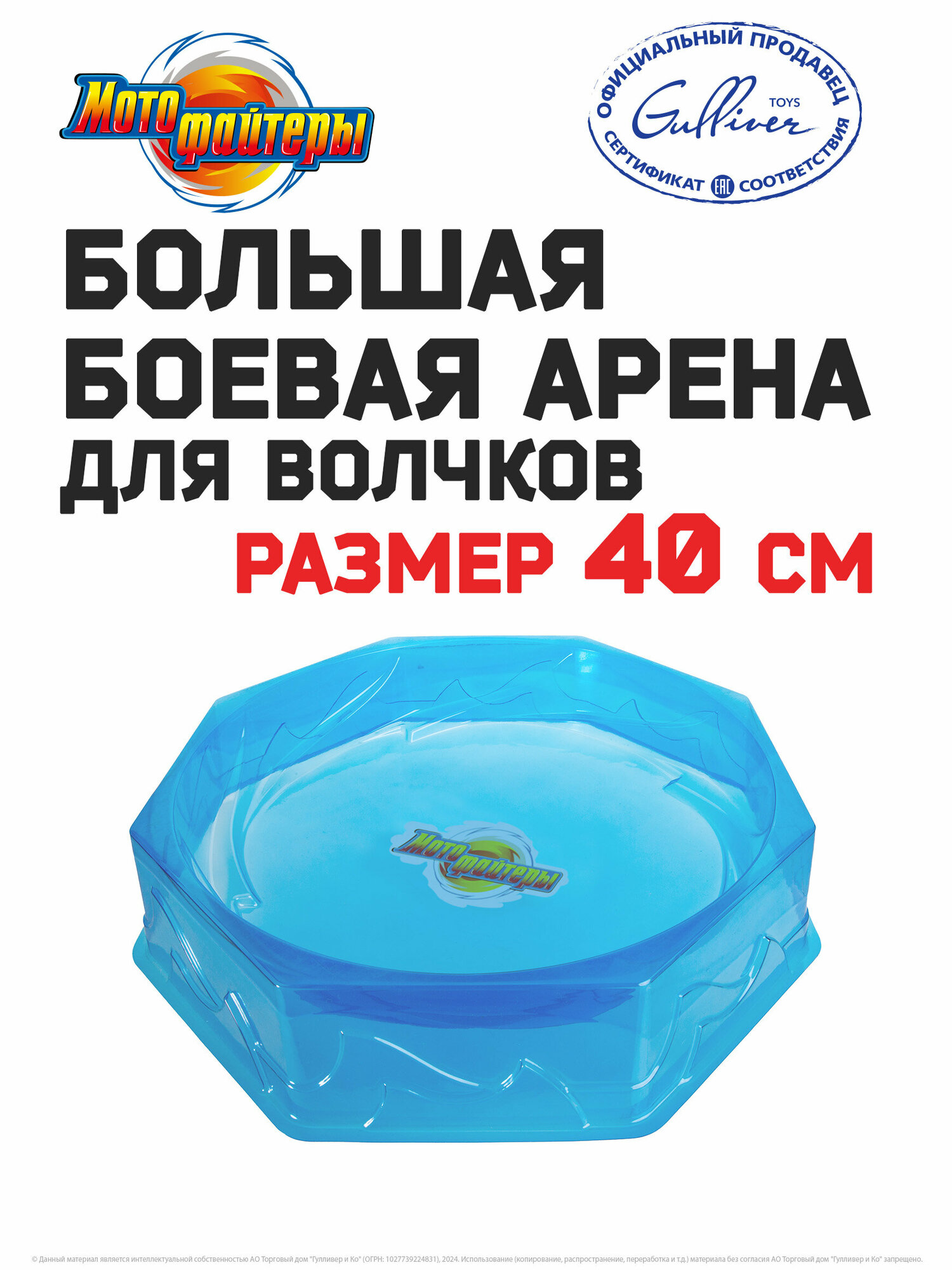 Новые волчки Мотофайтеры позволяют по новому взглянуть на блейд-баттлы и наслаждаться игрой на совершенно ином, новом уровне. С ареной для баттлов Мотофайтеры игра станет более динамичной и увлекательной. Также этот незаменимый аксессуар для игры с волчками поможет сохранить мебель и предметы интерьера дома, которые можно повредить при запуске волчков на полу. Арена сделана из качественного и безопасного ударопрочного пластика. Благодаря большому диаметру, на арене можно проводить баттлы четырех и более волчков. Высокие борта арены обеспечивают безопасность ребенка во время запуска волчка. Благодаря специальной форме арены волчки собираются в ее центре, чаще сталкиваются и игра становится более динамичной и интересной даже если запущены всего два волчка, а дополнительные выступы по бортам арены меняют направление движения волчков при столконовении.Диаметр арены составляет 36 см.