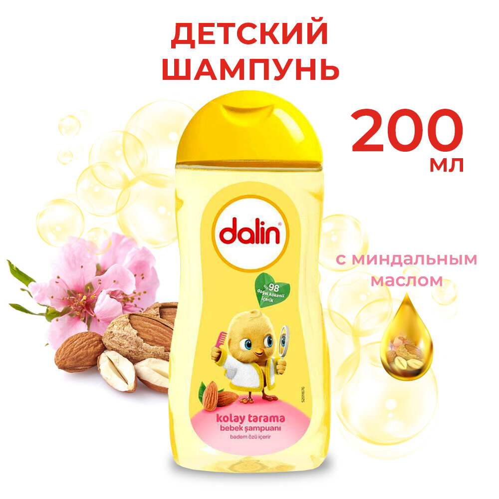 Шампунь Dalin для легкого расчесывания обеспечивает легкое расчесывание волос вашего ребенка благодаря новой мягкой формуле, содержащей миндальный экстракт. Помогает легкому расчесыванию спутанных, трудно расчесываемых волос. Придает мягкость и блеск волосам, обеспечивает эффективное очищение. Вы можете добиться идеальных результатов при использовании dalin спрея для легкого расчесывани. Клиническими испытаниями было доказано, что он не обжигает глаза. Он прошел педиатрические, дерматологические и офтальмологические испытания и признан пригодным для использования на чувствительной коже. 0% парабен, краситель, SLS, SLES, спирт.
