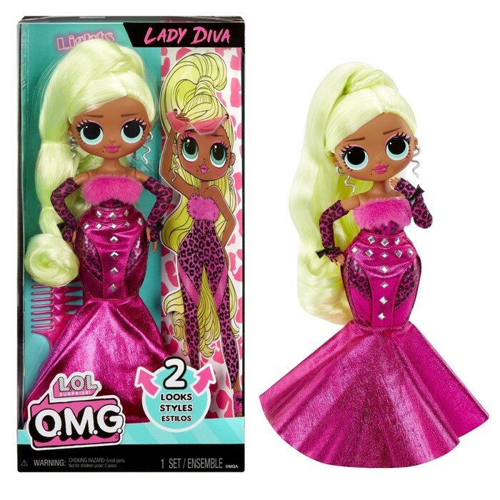 ЛОЛ Сюрпрайз – это яркие и ультрамодные куклы для девочек, которые нельзя ни с кем спутать! Встречай переиздание твоей любимой коллекции ЛОЛ Сюрпрайз ОМГ! Героини ОМГ возвращаются в еще более ярких и стильных образах! Поздоровайся с Леди Дивой - поп-звездой, которая любит быть в центре внимания и помогать друзьям раскрыть свою внутреннюю диву! Она готова к подиуму! Одень Леди Диву в стильный топ с гепардовым принтом и милыми бантиками на рукавах, а также блестящую розовую юбку. Трансформируй! Открой для себя еще один сюрприз Леди Дивы и мгновенно преобрази ее наряд: найди под ее юбкой брюки с гепардовым принтом и создай совершенно другой образ! Распакуй несколько сюрпризов: модную куклу ОМГ, ее яркую одежду, гламурные солнцезащитные очки, стильные серьги, туфли и расческу для волос!Собери все 4 куклы ЛОЛ Сюрпрайз ОМГ HOS: Свэг, Неонлишес, Леди Диву и Роял Би! В игровом наборе ЛОЛ СЮРПРАЙЗ ОМГ HoS Леди Дива кукла с длинными густыми прошитыми волосами, подвижными ручками и ножками, включая локтевые и кистевые суставы (9 точек артикуляции), комплект одежды с возможностью трансформации наряда, обувь, модные аксессуары, расческа для куклы. Игрушка изготовлена из полимерных материалов с элементами из текстиля. Товар сертифицирован и безопасен для детского использования. Упаковка: коробка с окном 15х7х30.5 см.
