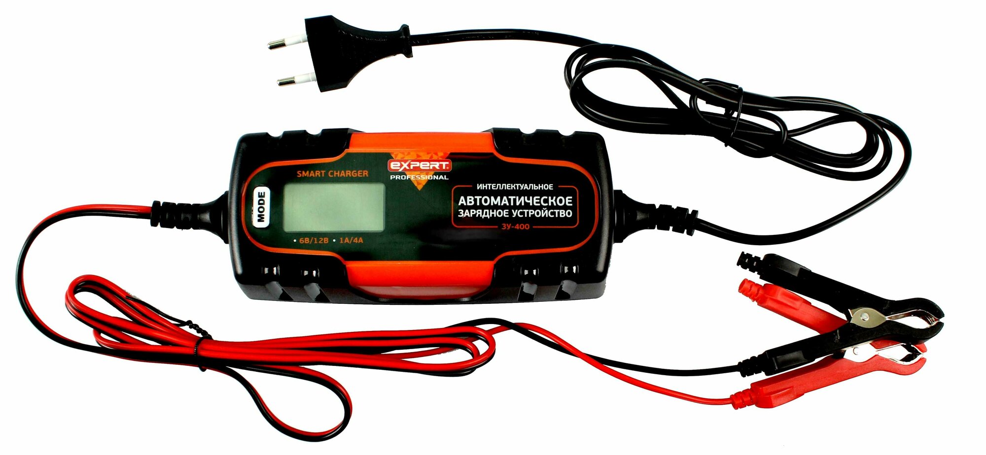 **Автомобильное зарядное устройство Expert ЗУ-400** — интеллектуальный прибор во влагозащитном корпусе. Предназначен для автоматической зарядки и поддержания заряда в 6 и 12 В. Используется для аккумуляторных батарей емкостью до 120 Ач. Оснащено 4 режимами зарядки, включая быстрый. Показания прибора выводятся на большой дисплей: напряжение в данный момент времени, прогресс зарядки, отсутствие или неверное подключение, окончание процесса зарядки, выбранная программа работы. Устройство в автоматическом режиме может провести анализ состояния батареи. Отличается минимальным энергопотреблением, защитой от механических повреждений, короткого замыкания, перепадов напряжения в сети, неправильного подключения.