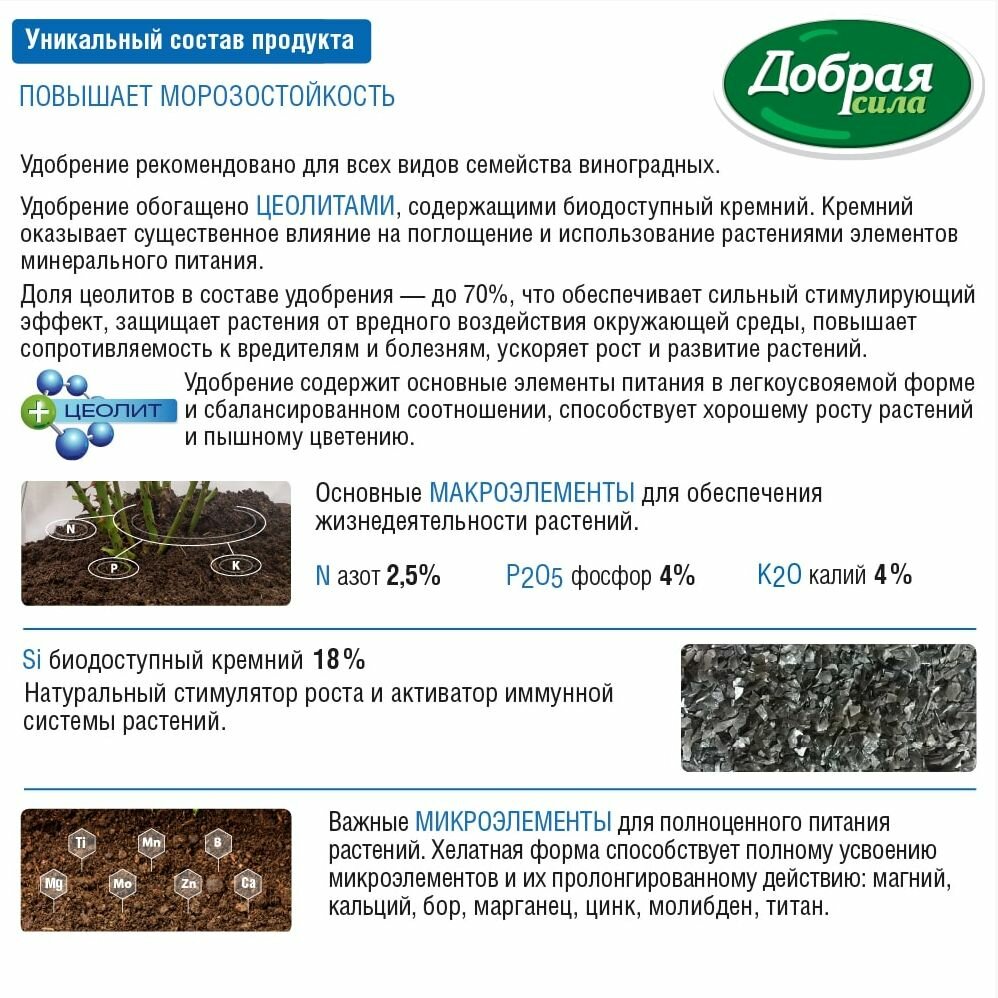 | Состав (%) | азот (N) – 2,5 %, фосфор (P2O5) – 4 %, калий (K2O) – 4 %, кремний (Si) – 18 % |