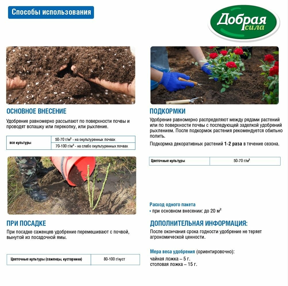 | Способ применения | Основное внесение – удобрение равномерно рассыпают по поверхности почвы и проводят вспашку или перекопку, или рыхление. При посадке саженцев удобрение перемешивают с почвой, вынутой из посадочной ямы. Подкормки – удобрение равномерно распределяют между рядами растений или по поверхности почвы с последующей заделкой удобрений рыхлением. После подкормок растения рекомендуется обильно полить. Подкормка декоративных растений 1-2 раза в течение сезона. |